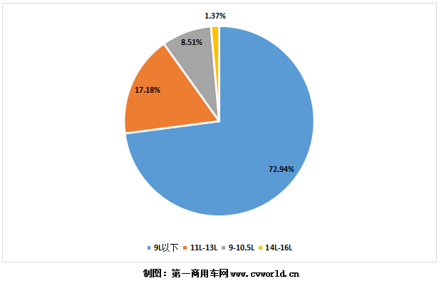 从发动机排量来看,由于柴油车国六排放法规先在城市重型车辆中推行,因此,今年1-7月的国六柴油重卡发动机销量中,9L以上排量动力占比相对不高。如果分析国六重卡销量整车占比结构即可看出,在重卡的四大品种中,国六柴油专用车和载货车这两大品种的占比是最高的,柴油牵引车和自卸车占比相对较低。其中原因主要在于城市类专用车以及一部分城市类货车提前从今年7月1日起实施国六,比其他柴油车早了一年。在为国内重型专用车和载货车配套的柴油动力中,9L及以下排量的发动机比例比较高,占主体地位,因此,这也就不难解释为什么1-7月9L以下排量发动机占到了72.94%的比重,9-10.5L排量占了8.51%,11-13L占比17.18%,14-16L占比1.37%。