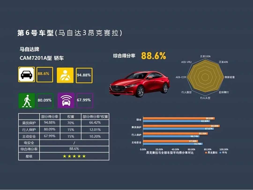 测试车型是昂克赛拉 2.0L AT 质雅型 三厢,属于销量较大的配置,试验车购买价格14.39万元。马自达3是一款极具历史性的车型,之前几次换代车型先后历经3次C-NCAP测试,成绩从4星到5+星都有。此次在更严格的2018版规则下,全新昂克赛拉还是顺利获得了5星。