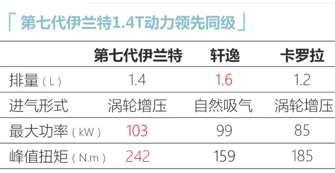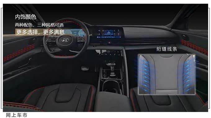 第七代伊兰特内饰提供2种配色,3种风格可选,其中在黑色内饰基础上,1.4T车型还有专属红色缝线分布在方向盘、座椅和车门饰板上。配置部分,新车会有一般、高级、豪华三种仪表及中控屏样式。此外,第七代伊兰特还配有贯穿式出风口、64色氛围灯、飞航式换挡杆以及23项智能驾驶辅助功能。动力方面,第七代伊兰特采用全新i-GMP平台打造,提供1.5L+CVT、1.4T+7DCT两种动力总成,在保障动力的同时有效降低油耗。