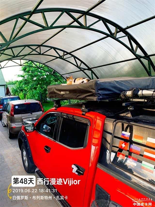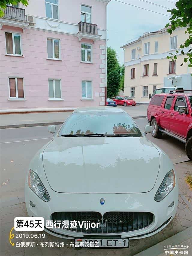 在白罗斯最后一家酒店的停车场里,偶遇四位骑士的座驾,三位来自斯洛伐克,一位来自瑞士,猜想这四位也是国际纵队,看见车窗上面的国旗,他们已经穿越了许多国家,我特意把大红停在紧后面,给五匹万里马合影留念。We all are on the road!