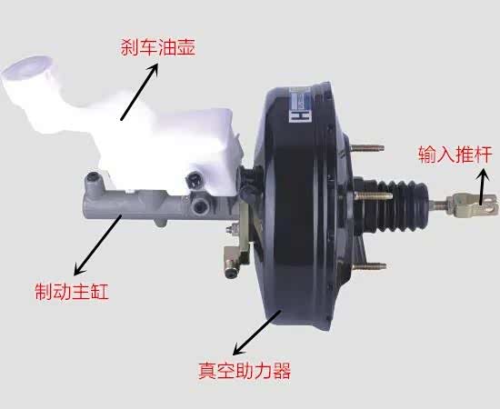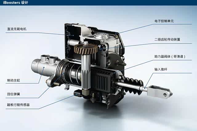 看iBooster的结构图(图为一代),再与真空助力器对比一下,输入和输出部分和传统真空助力器相同,输入推杆连接到刹车踏板,制动主缸连接到刹车卡钳。