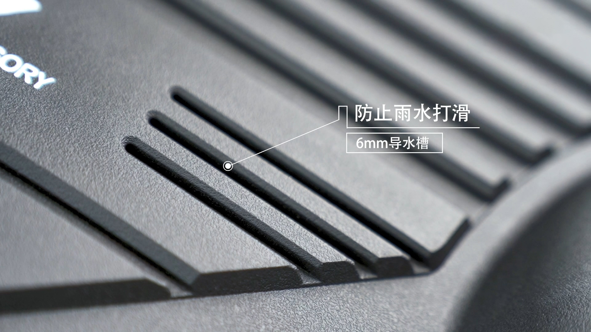 ▲前排轨道处刚好,没有卡住,脚垫四周和里面都有凹槽,这样雨水会渗透到导流槽里,不容易打滑!