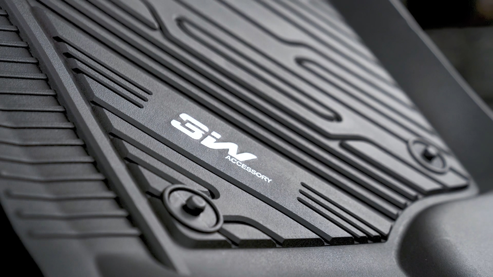 ▲装车后效果,凸起的两个地方是毯面的卡扣,看着有点怪怪的,整个脚垫机械感很强,看着很有superman的节奏!