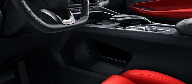 UNI-T的座椅是一体式运动化设计,提供了很好的支撑和包裹感,内饰也选择了红黑搭配,材质则是全新NAPPA真皮,所触之处皆是质感。还有带有夹角设计的双10.25寸的高清屏幕,给驾驶者带来清晰的阅读体验,创意性的镂空中控台和独创的太空战舰电子档杆科技感十足。