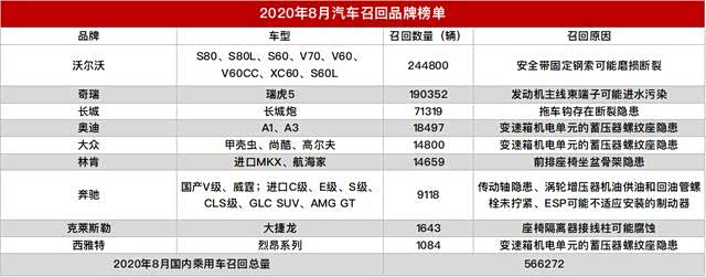 沃尔沃8月召回量位居第一