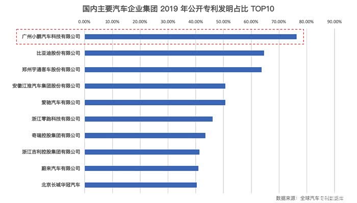 投入了如此夸张的研发人员和资金后,小鹏汽车的专利数量已经在全行业处于领先位置。根据2019年中国汽车专利数据统计分析榜单显示,小鹏汽车凭借2019全年742件汽车专利公开量,跻身2019年中国汽车专利公开量TOP 20,有两项分类专利数据名列国内汽车企业之首。其中发明专利占比高达76.28%,占据国内汽车企业第一。