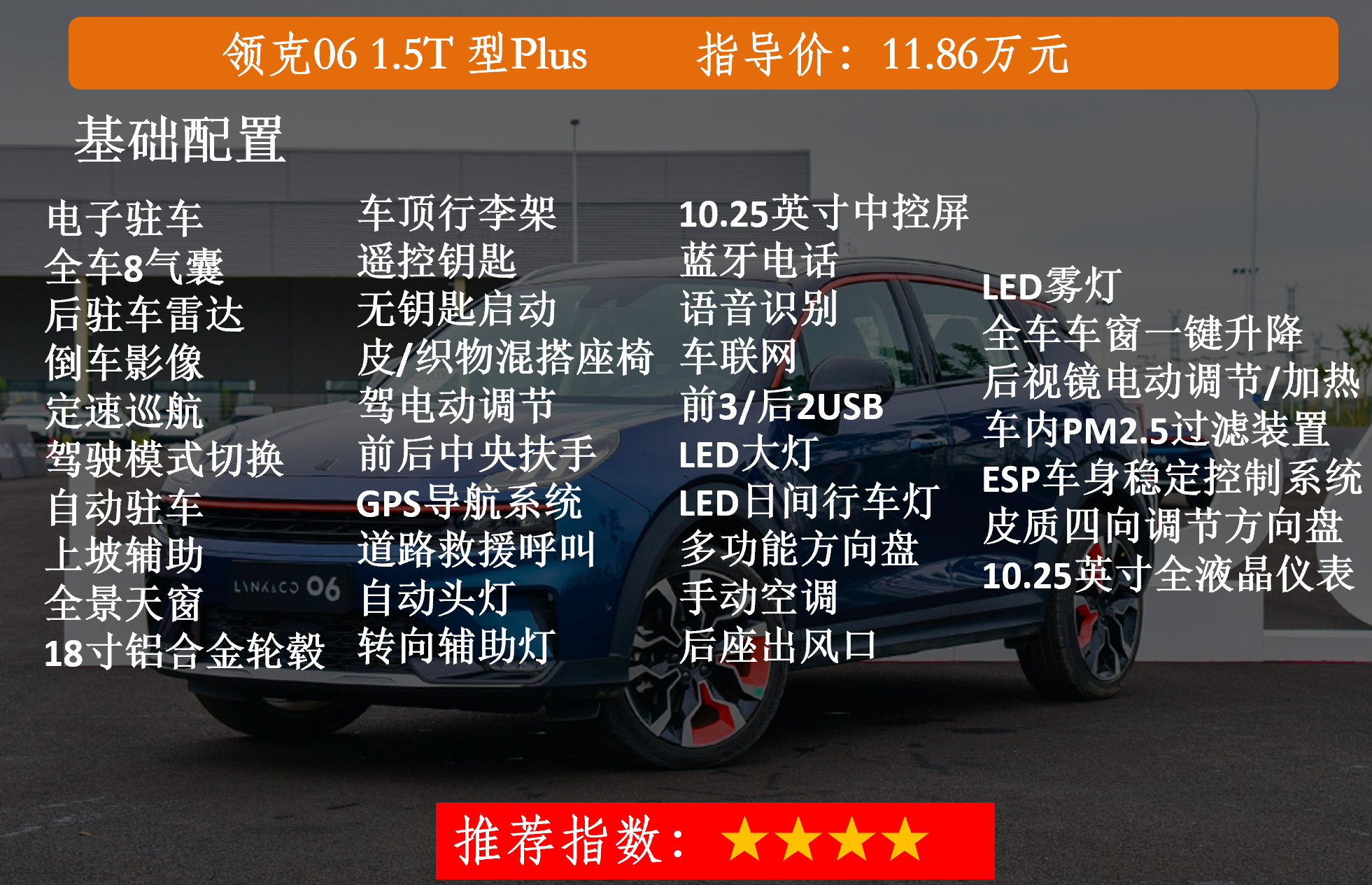 首先来看入门版型Plus,官方指导价11.86万元,在配置上拥有电子驻车、全车8气囊、ESP车身稳定控制系统、后驻车雷达、倒车影像、定速巡航、驾驶模式切换、自动驻车、上坡辅助、全景天窗、18寸铝合金轮毂、车顶行李架、遥控钥匙、无钥匙启动、皮质四向调节多功能方向盘、10.25英寸全液晶仪表、皮/织物混搭座椅、主驾电动调节、前后中央扶手、10.25英寸中控屏、GPS导航系统、道路救援呼叫、蓝牙电话、语音识别、车联网、前3/后2USB、LED大灯、LED日间行车灯、自动头灯、转向辅助灯、LED雾灯、全车车窗一键升降、后视镜电动调节/加热、手动空调、后座出风口、车内PM2.5过滤装置。虽然是入门车型,配置还是挺全的。