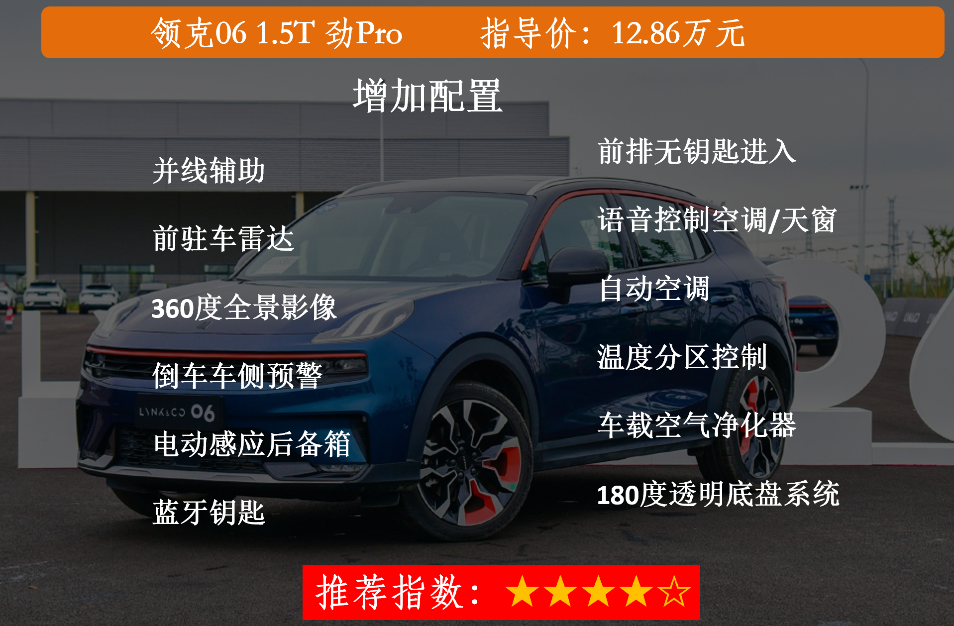 来到中配劲Pro,比型Plus贵了1万元,配置上多出了并线辅助、前驻车雷达、360度全景影像、倒车车侧预警、电动感应后备箱、蓝牙钥匙、前排无钥匙进入、语音控制空调/天窗、自动空调、温度分区控制、车载空气净化器、180度透明底盘系统。相对于增加的1万元,这些配置绝对属于物超所值。