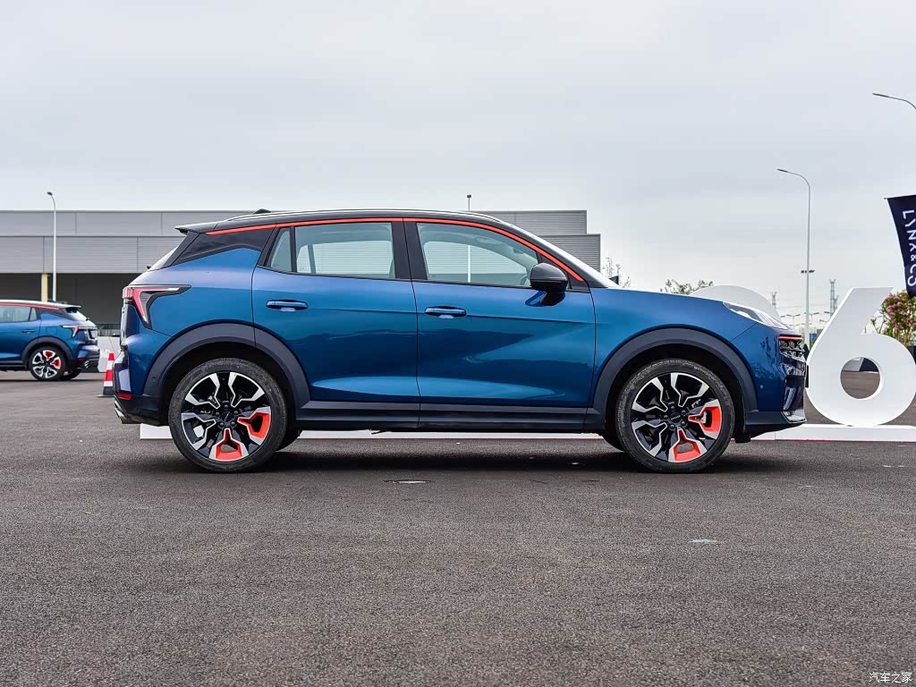 来到车身侧面,领克06的车身线条与兄弟车型领克02比较相似,都有点小溜背的感觉。侧面线条比较简洁,一条笔直的腰线贯穿前后门把手;B柱、C柱采用了熏黑处理,营造出了悬浮车顶的效果,配合车轮、车顶线等处的橙色元素,提升了侧面的时尚感。车身尺寸方面,新车长宽高分别为4340*1820*1625mm,轴距为2640mm,属于偏大的小型SUV尺寸。