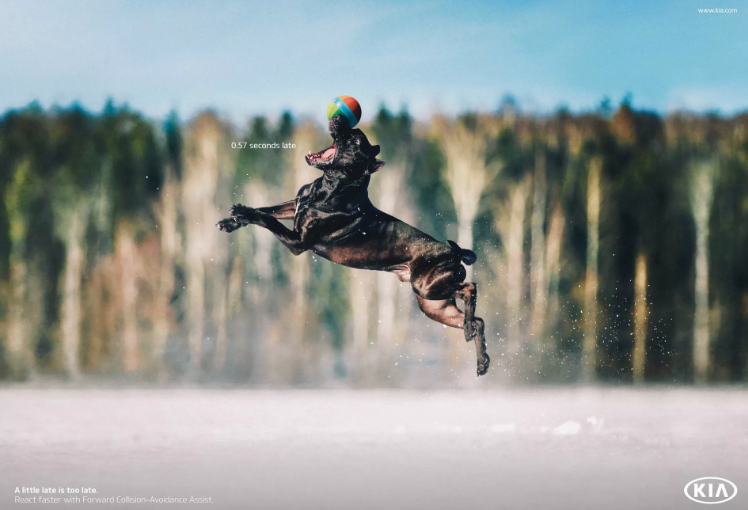 柏林的广告代理商Innocean为起亚的防撞辅助系统,推出了一组以三只叼飞盘的狗狗为主题的海报。海报中狗狗们因反应失败而错失玩具,反被玩具拍脸的悲伤画面,是不是有点像紧急时刻,踩刹车反应慢半拍而造成交通事故的司机的脸色?