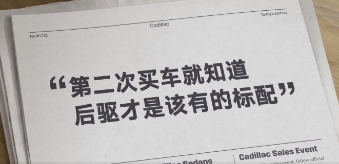 与此同时,凯迪拉克还在广告中反复插入“,没有后驱,不算豪华”的广告语,洗脑的同时又贯穿凯迪拉克对后驱的执念。