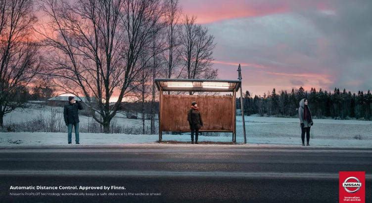 尼桑很好地将芬兰人对个人空间的重视程度,运用到了其自适应巡航功能中。将芬兰人等车时,人与人之间保持一定距离的照片制作成推广海报。用以说明,车与车之间因保持一定距离,这样才安全,让懂它的人会心一笑。