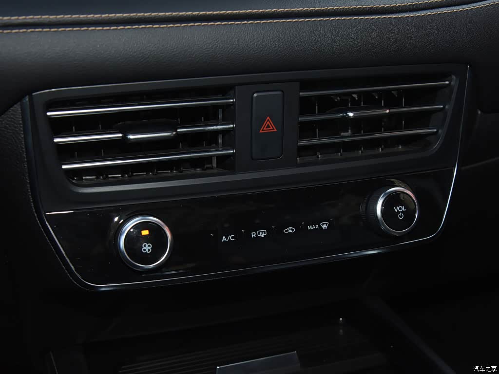 中央出风口下部是空调和音量大小的实体旋钮,保留这几个基本按键也增加了副驾驶听音乐的便捷程度,毕竟主驾驶按多功能方向盘就能调节音量了。