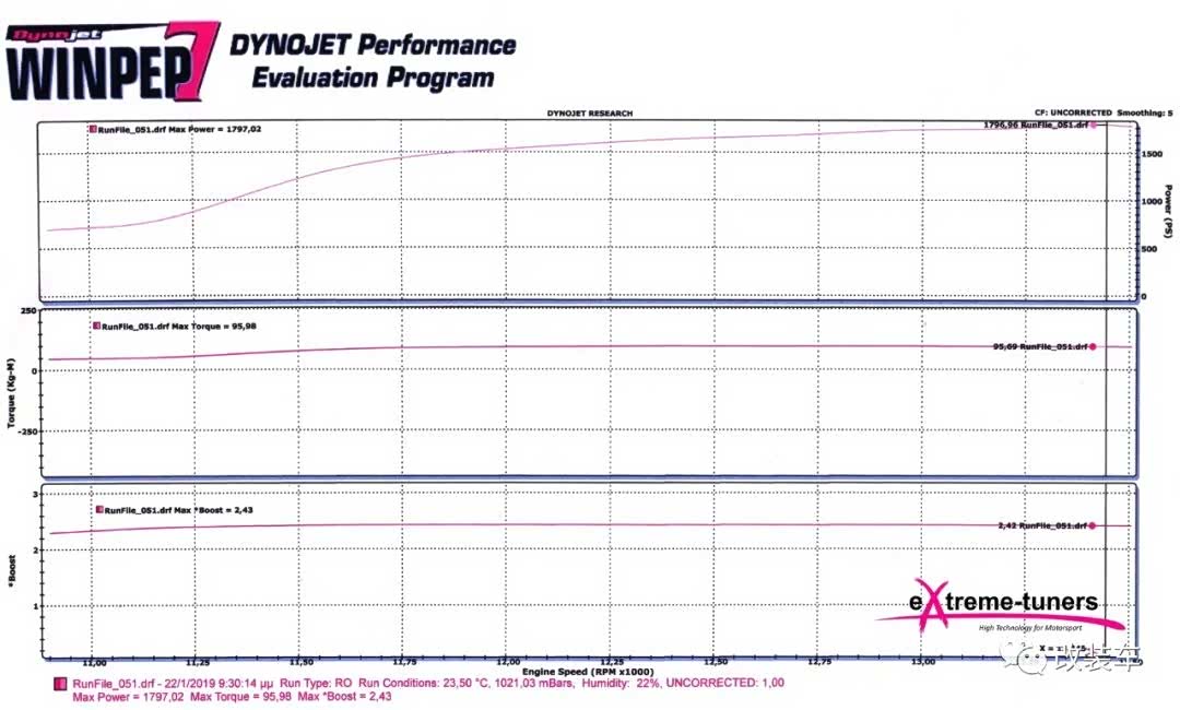 从上往下依次是动力曲线、扭矩曲线还有增压值。11000rpm后,轮上马力才有一个大跃进,从大约700匹一路直飙升到1797匹,这就是强者的世界吗?