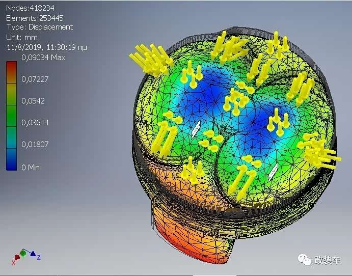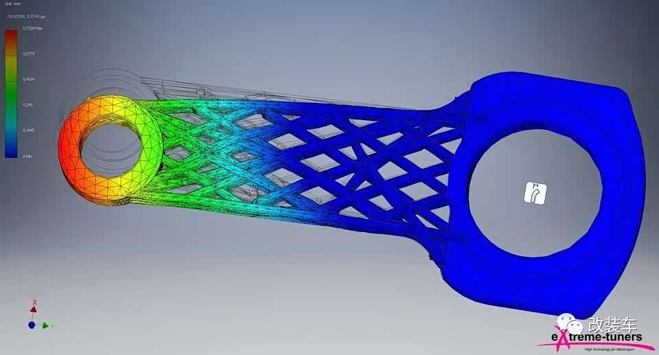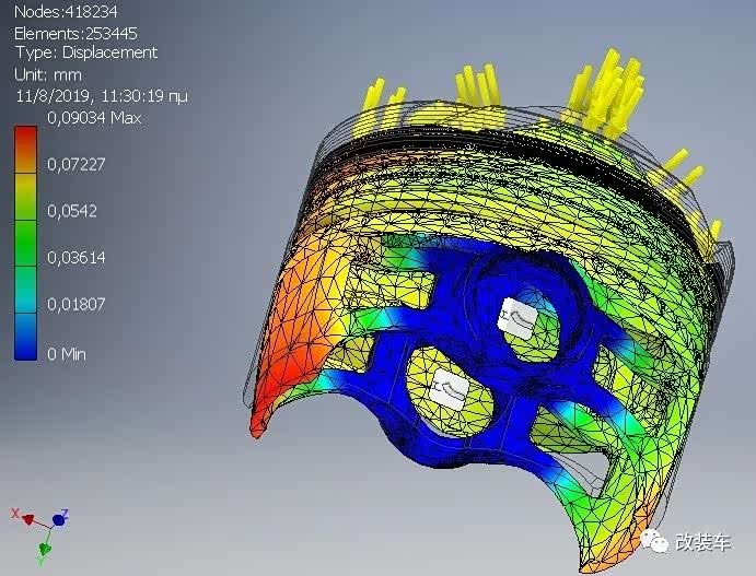 除了碳纤维复合材料连杆外,活塞也有新的材料,那就是陶瓷。3D打印的高凸陶瓷活塞,可以将压缩比提升到16.8:1。大量应力分析,就是为了确保它能承受得住更高的压力。