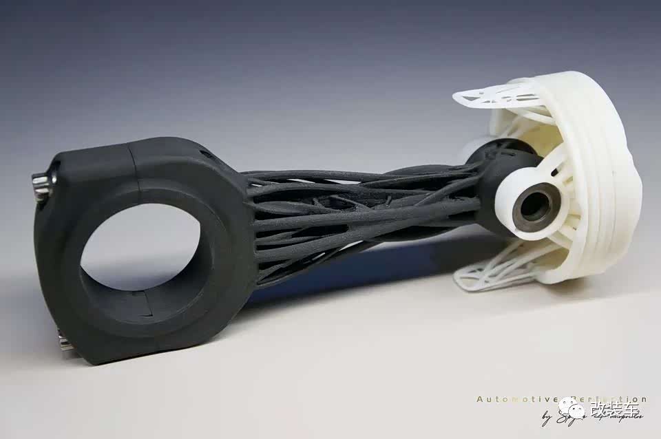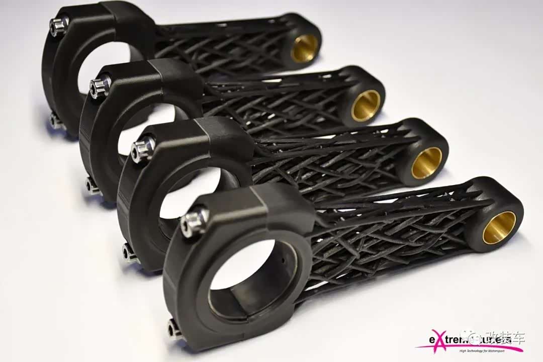 看看他们的杰作,碳纤维复合材料连杆(Carbon Composite rods),采用3D打印而成,看起来有些塑料感,数据却非常惊人。