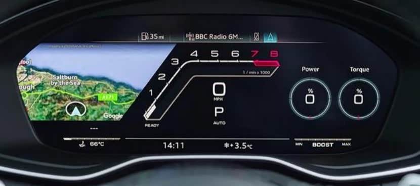 方向盘握感一流,甚至有点在开迈凯伦的感觉。就是它很细,它不是像宝马一样很厚的一个设计。平底的方向盘带RS标,基本上可以通过方向盘上面的按键配合虚拟座舱,来对车辆设置去做大部分的操作。在方向盘上面最厉害的一个按键就是RS Mode。在这台车真的是有太多东西可以选择了,它的驾驶可以选,悬挂可以选,转向可以选,转向可以选,发动机声音可以选,运动差速器也可以选,分别每一个选项都有三档可调,你在按一下的时候,它可以进入你第一个Preset的设定。第二下它可以进入RS2的预设设定。但是如果你把所有的东西都放在最运动的模式的时候,整个仪表它就开始变身了,整个转速表会变成了一个赛道一样的形状,右边是你的瞬时功率和扭矩,左边是你的加速度表,彷佛不跑起来就对不起这辆性能车。