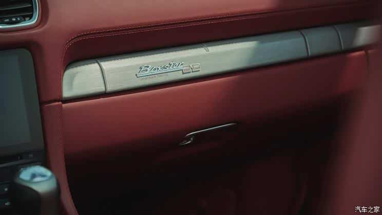 内饰方面,25周年车型限量版车型采用了波尔多红为主体的色调,材质多为皮质,档次感不言而喻。配置上,像是经典的机械式仪表、三幅式多功能方向盘以及内嵌式中控屏都有提供。另外,为了凸显限量版车型身份,副驾的手套箱上方、机械式指针仪表盘以及迎宾踏板处均标有“Boxster 25”的标志,副驾驶手套箱上的还刻有限量车型的产品序号。