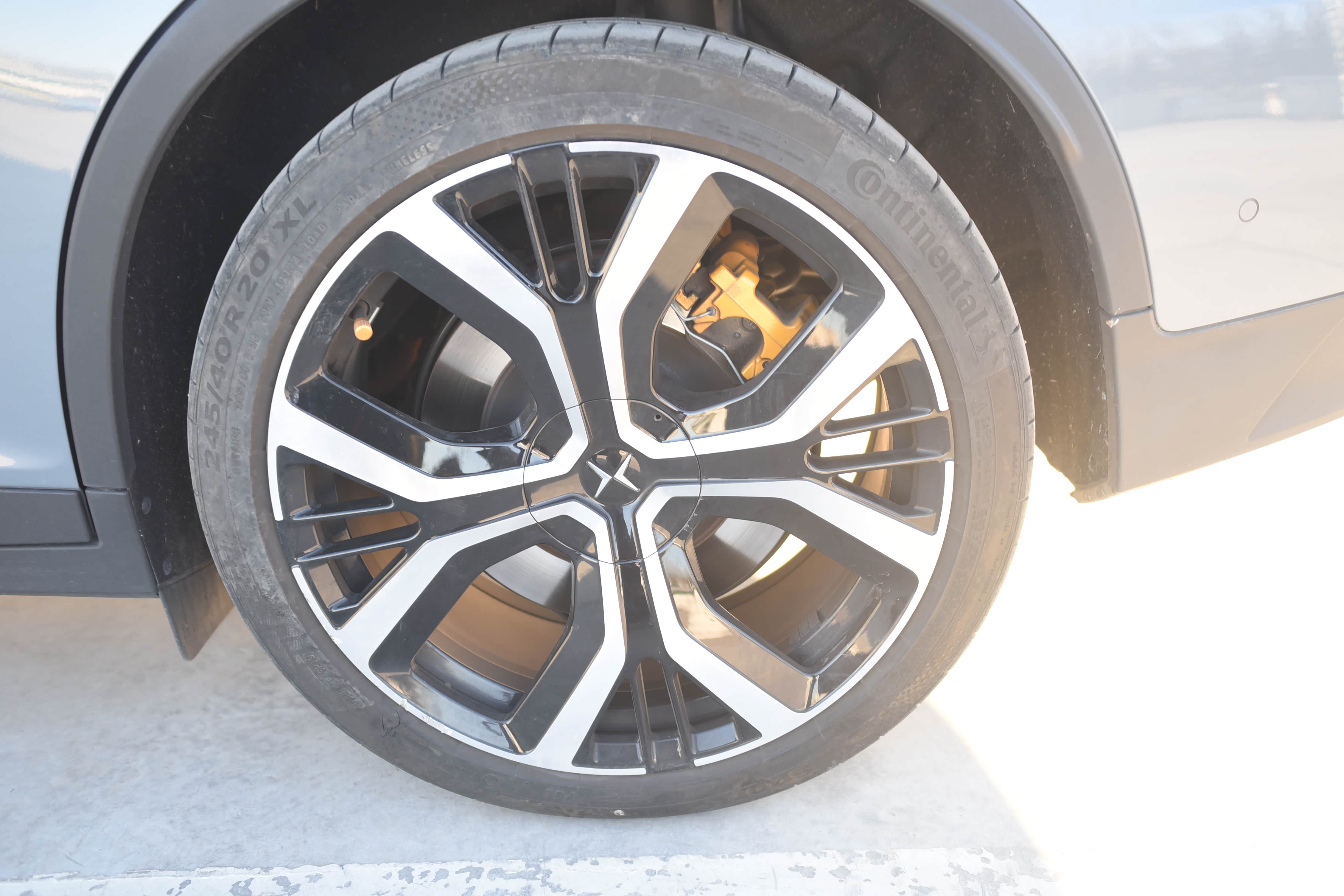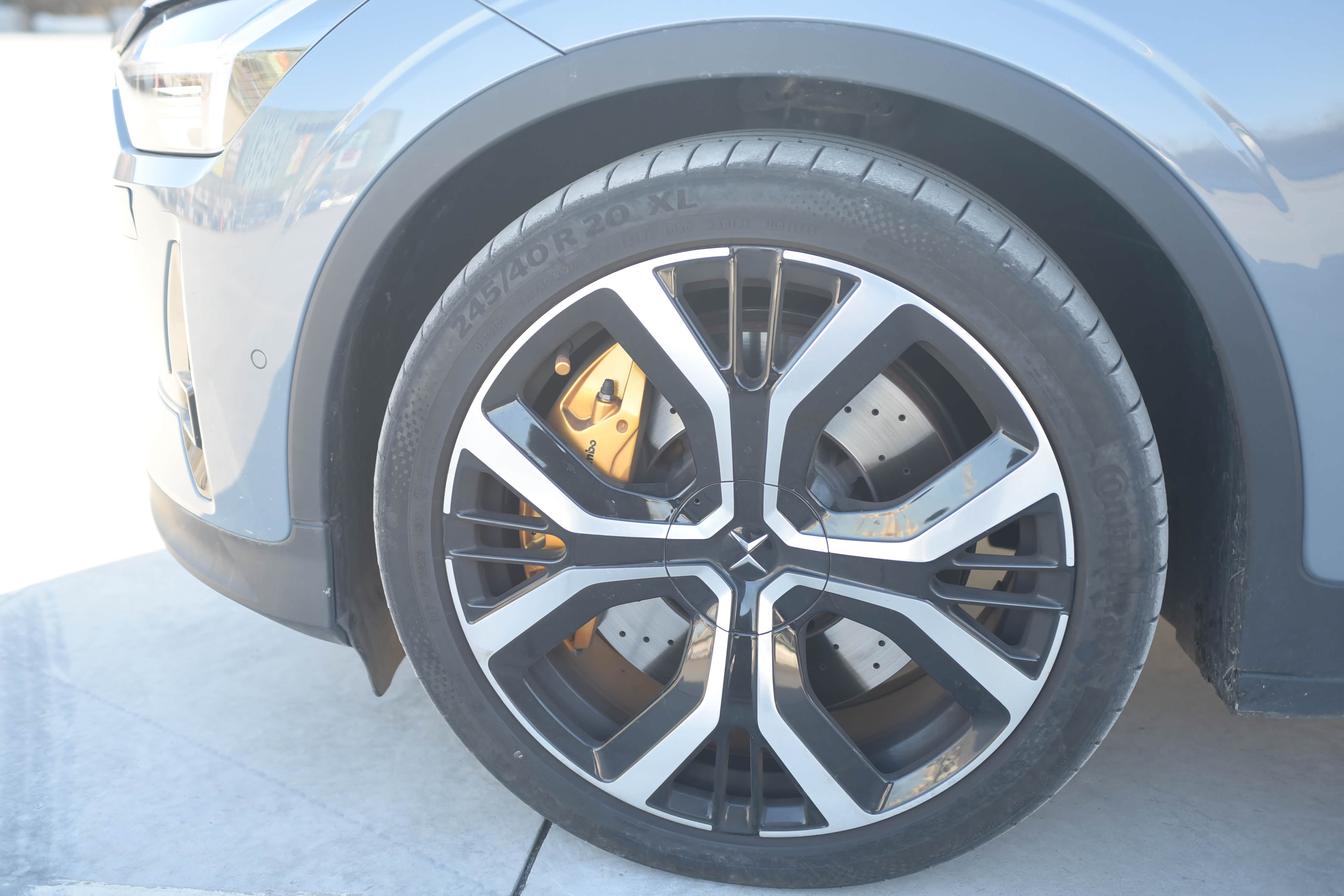 极星2轮毂采用20英寸双配色运动式铝合金轮毂,内配有4活塞Brembo前制动卡钳,轮胎采用德国马牌 SportContact 6 245/45 R20轮胎。