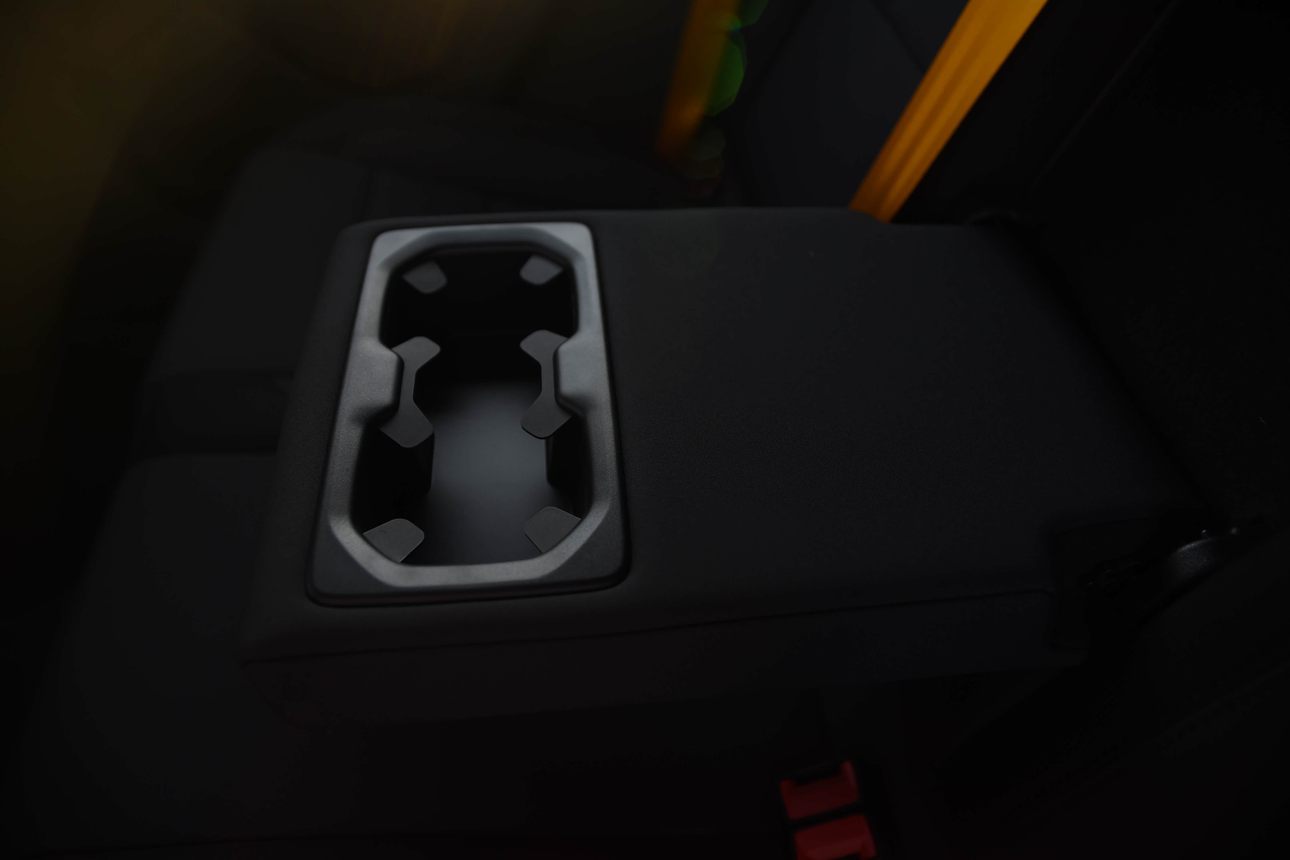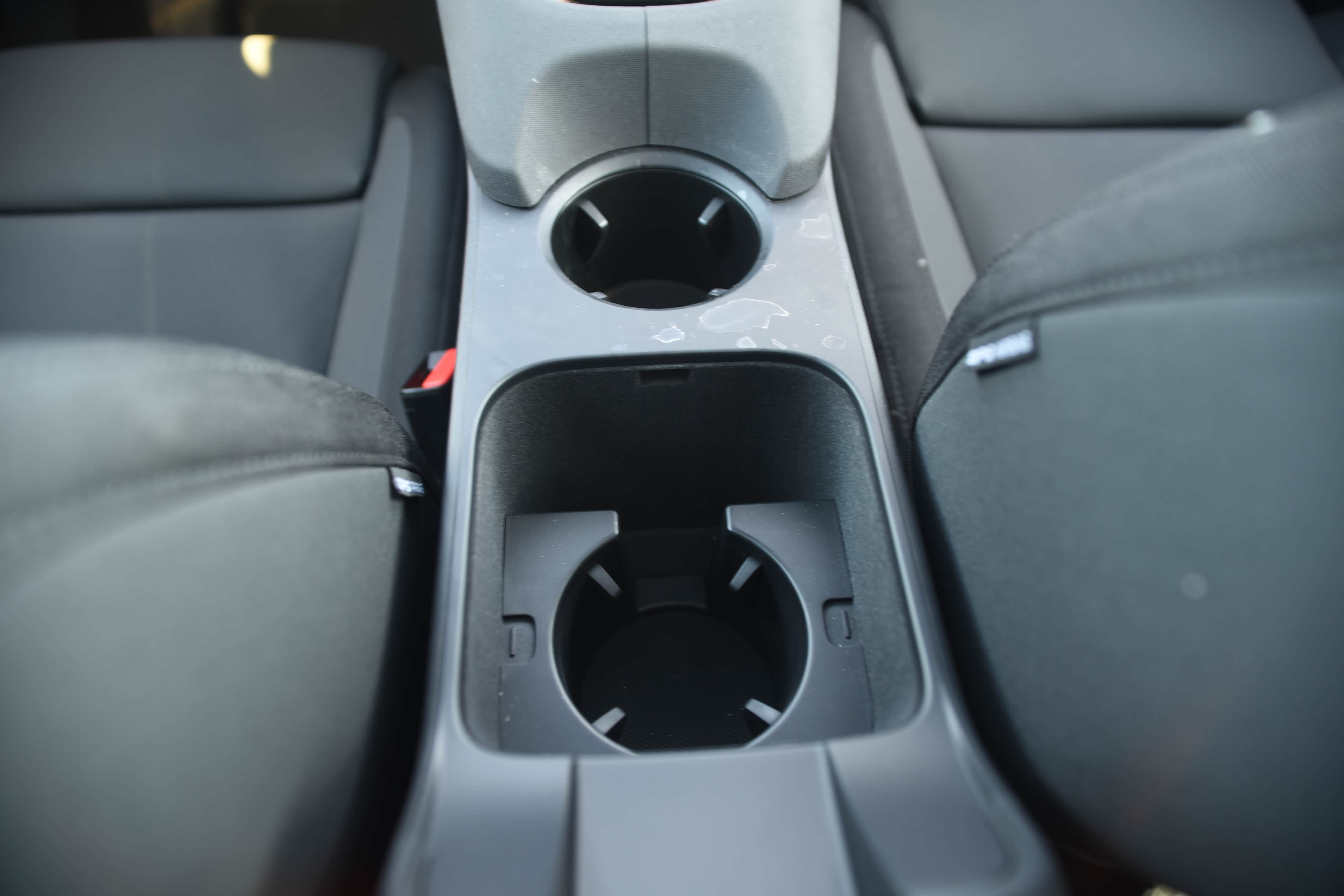 后排中央扶手设有两个中间有隔挡的杯架,但没配有储物槽,后排乘客放手机只能放在杯架内,这样设计不太人性化。