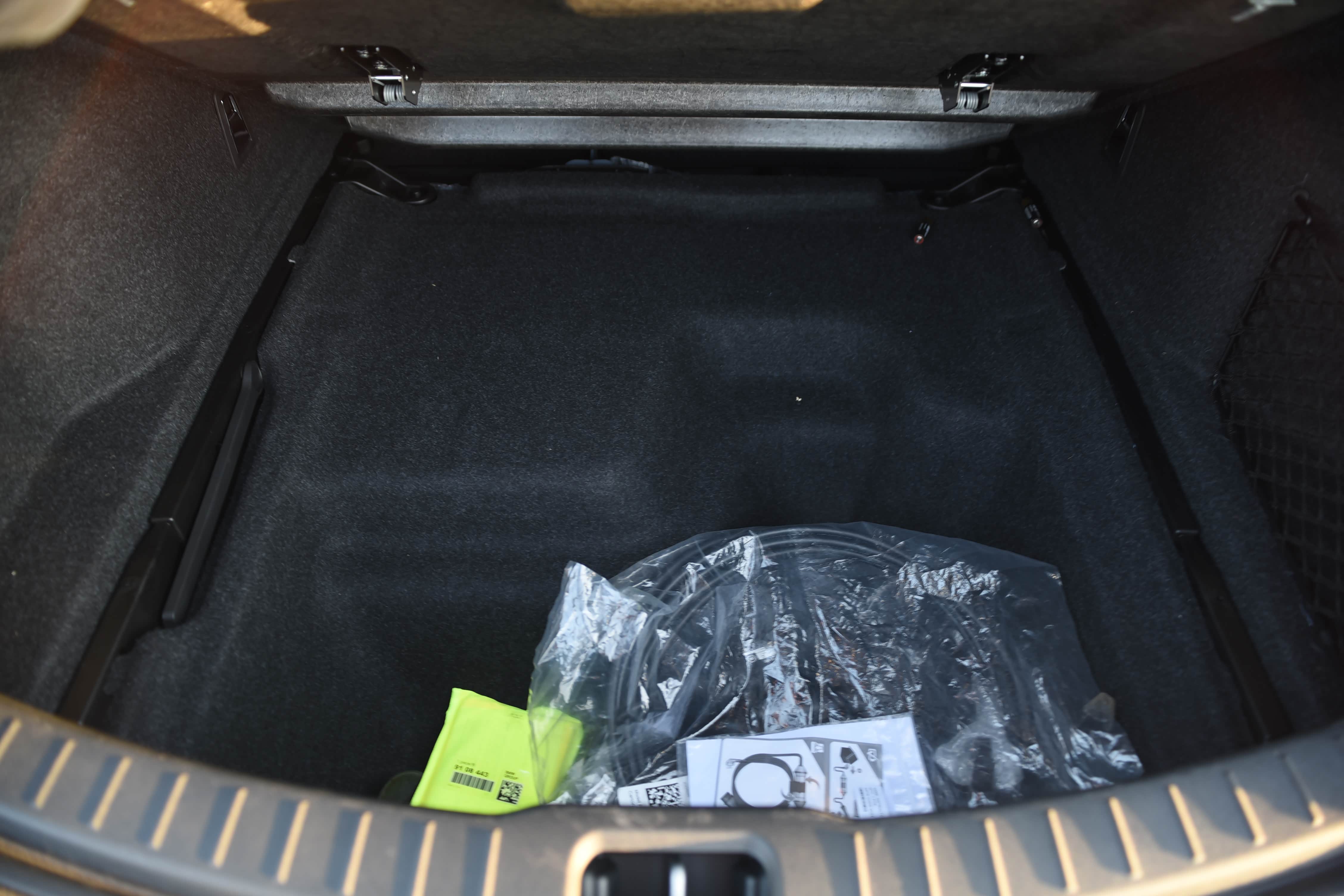 后备箱盖板下边配有1个大储物格,可以放补胎剂、补胎液、充电线、三脚架、医疗包等不经常用的物品,以备不时之需。