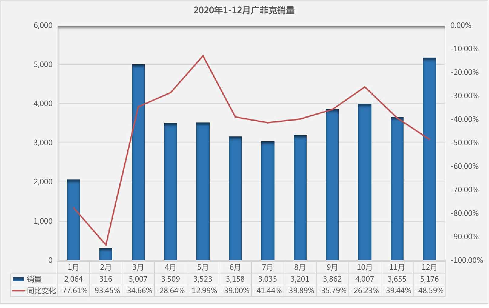 与北美市场销量表现不同的是,FCA在中国市场却呈现出持续下滑态势。据广汽集团发布的产销数据显示,2020年广汽菲亚特克莱斯勒(以下简称广汽菲克)全年销量仅为4.05万辆,同比下滑45.18%,是广汽集团旗下销量下滑最为严重的合资企业。即便是下半年疫情影响减弱和车市回暖,广汽菲克依旧呈现出两位数的下滑。
