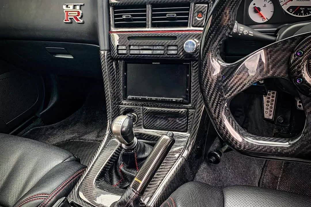 这台BNR34可以说是把原来相对低调的外形武装到战斗级别,碳纤机盖、碳纤前铲和碳纤风刀除了好看以外,还起到了减重和扰流的作用。要知道GT-R唯一被诟病的就是重量问题,所以恰当地减重改装绝对是增加战斗力的最好办法。
