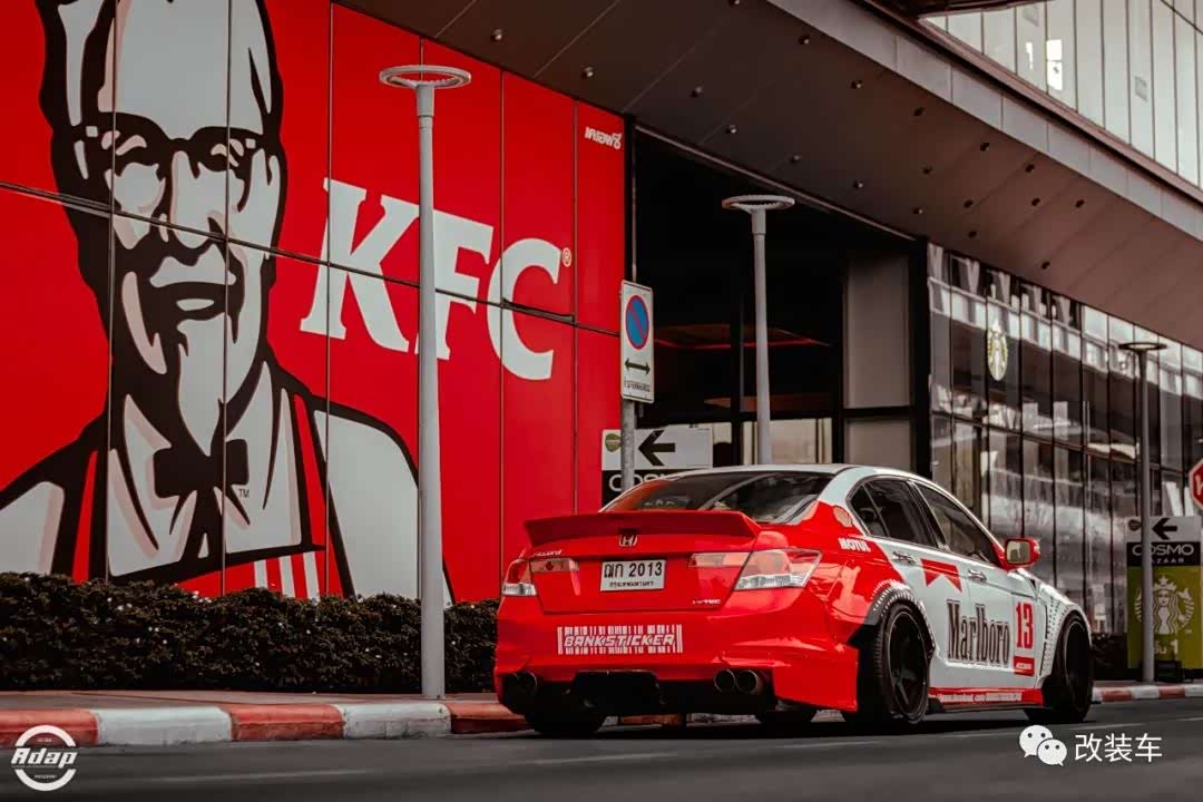 把这辆车停在肯德基爷爷隔壁,红白色的万宝路涂装和KFC配色竟然毫无违和感。