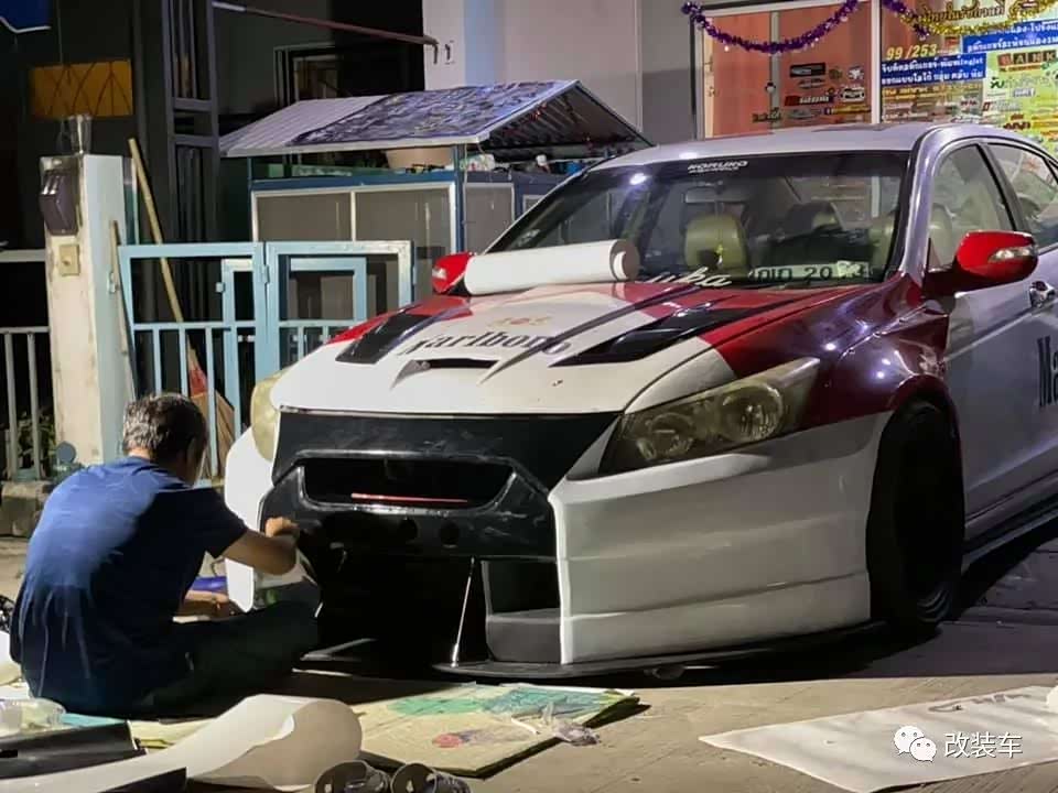 这辆雅阁是由泰国BANK STICKER打造,“泰仔”风格大家都懂的,癫和狂就是他们的代名词,这辆雅阁也逃不出他们的手掌心,为什么这么说?就看这前脸,小编第一眼还以为是被魔改的英菲尼迪呢,看了介绍才知道这是辆八代雅阁。