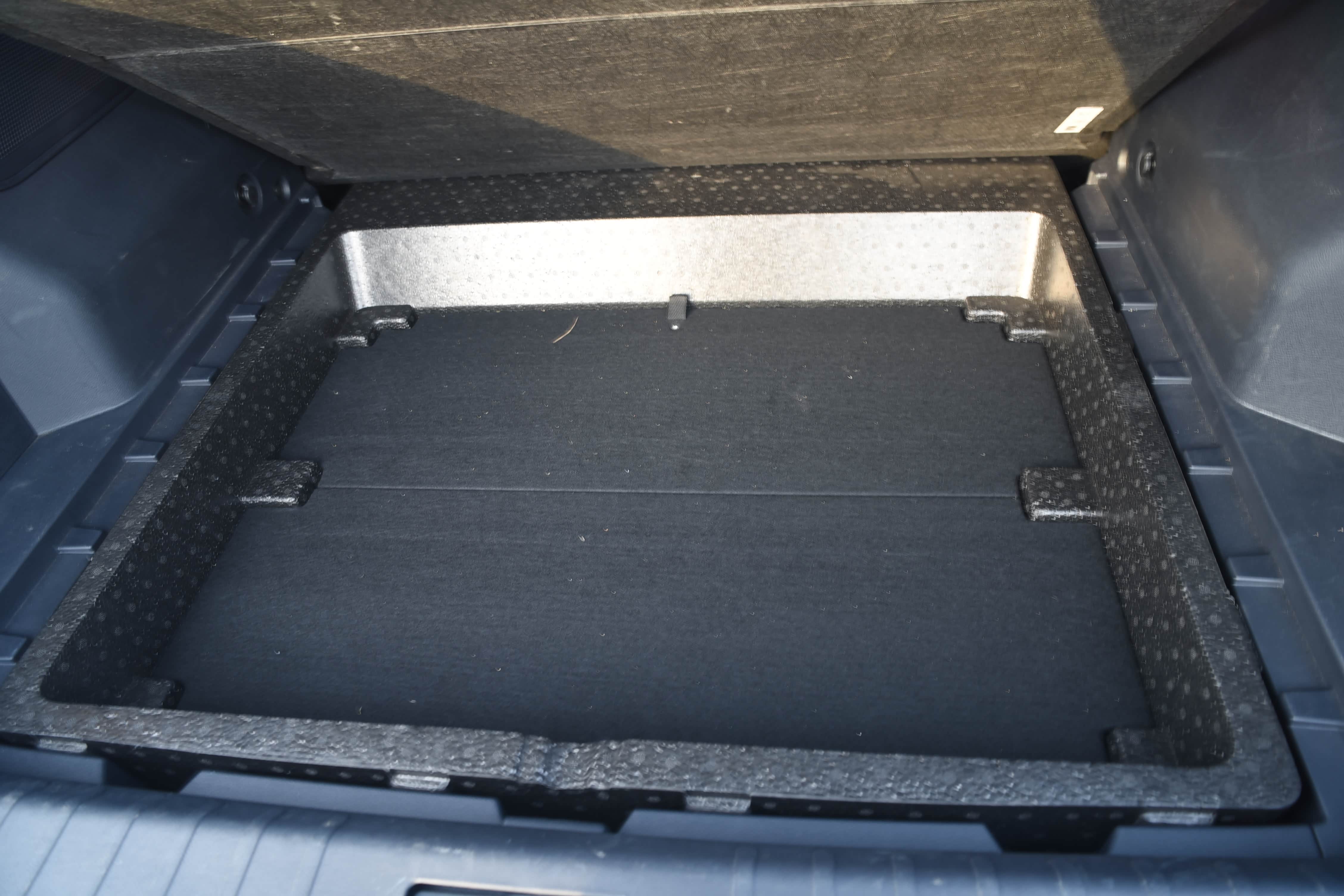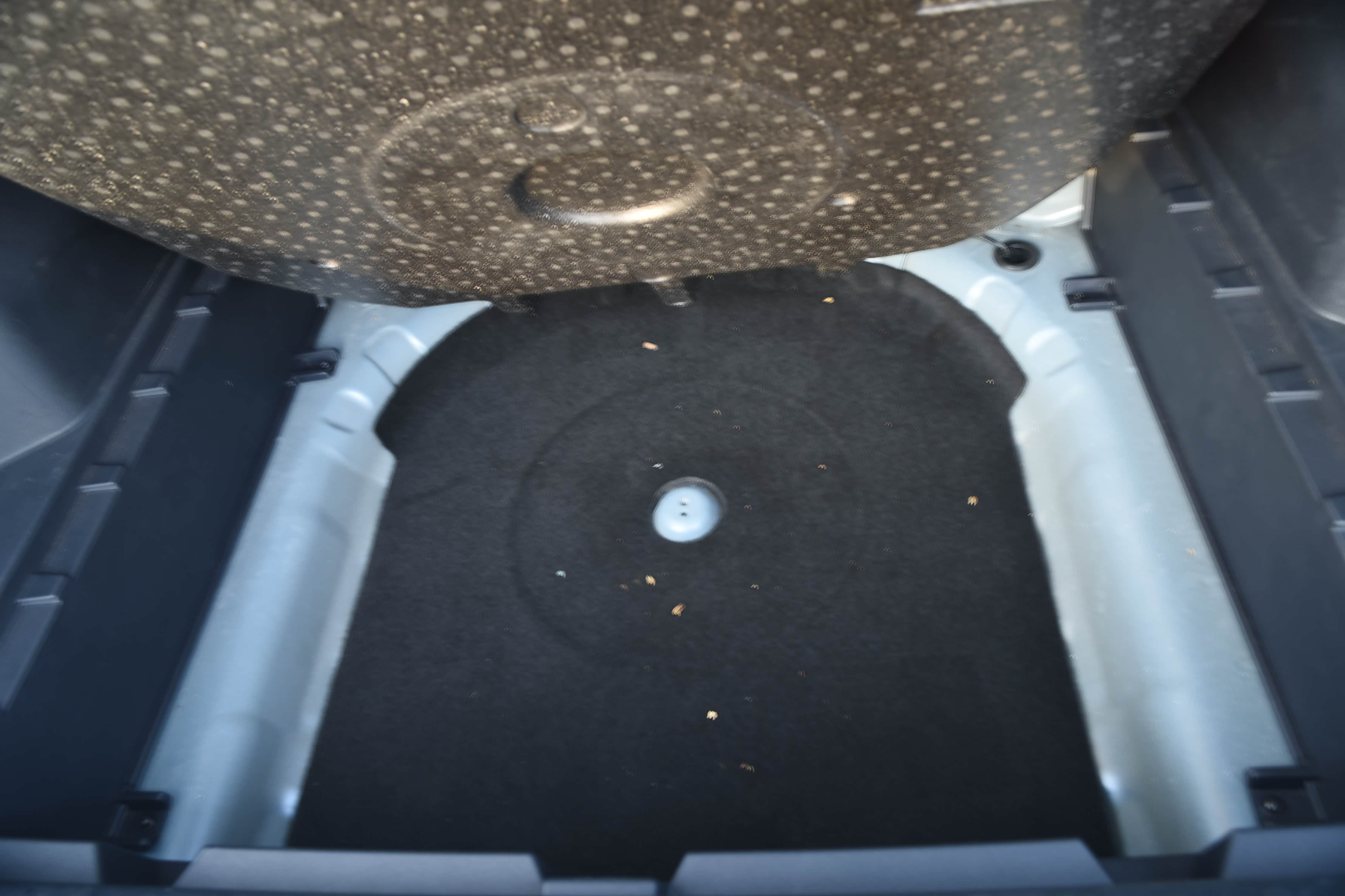 后备箱盖板下边配有1个大储物箱,可以放补胎剂、补胎液、充电线、三脚架、医疗包等不经常用的物品,以备不时之需。底部未配有备胎。