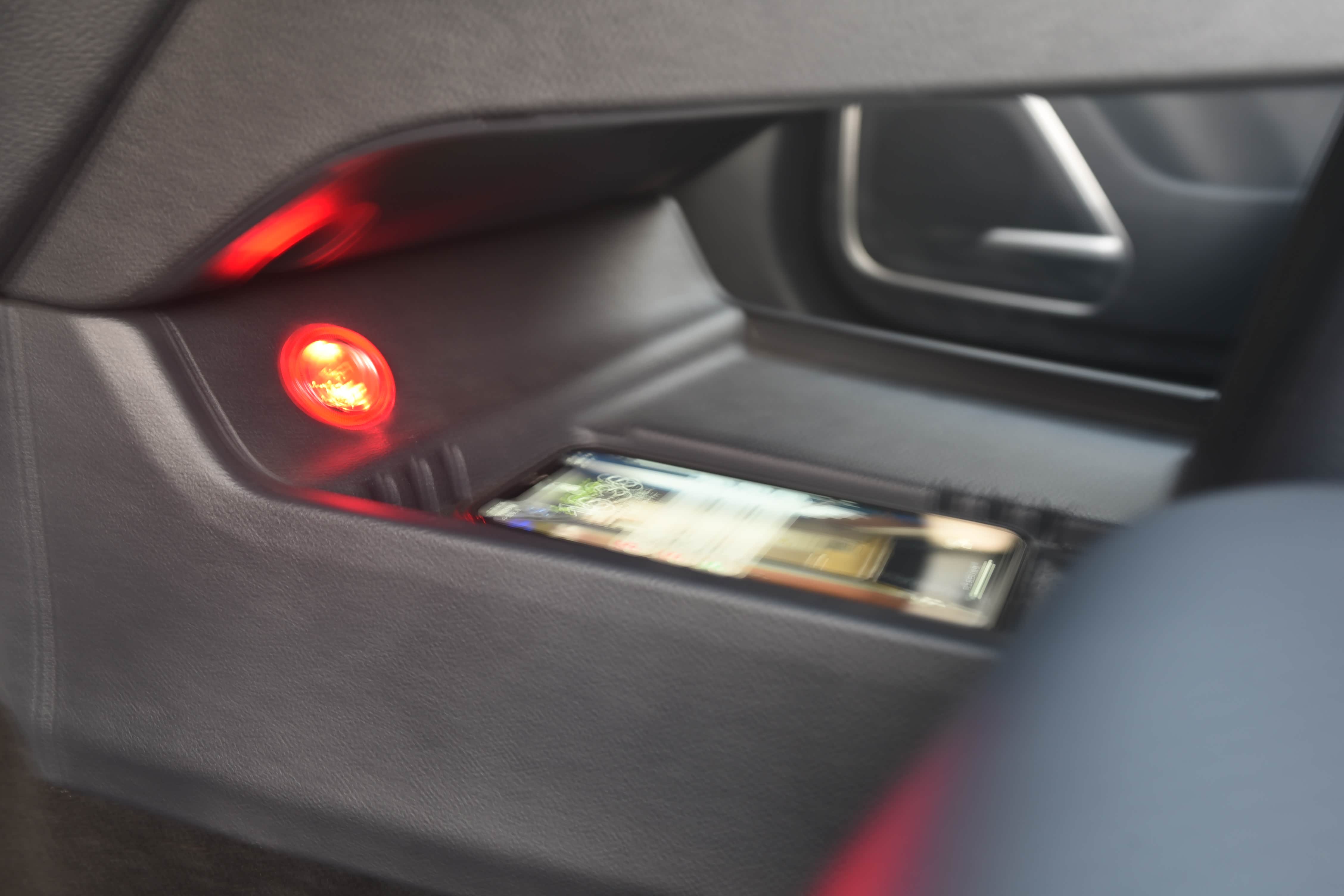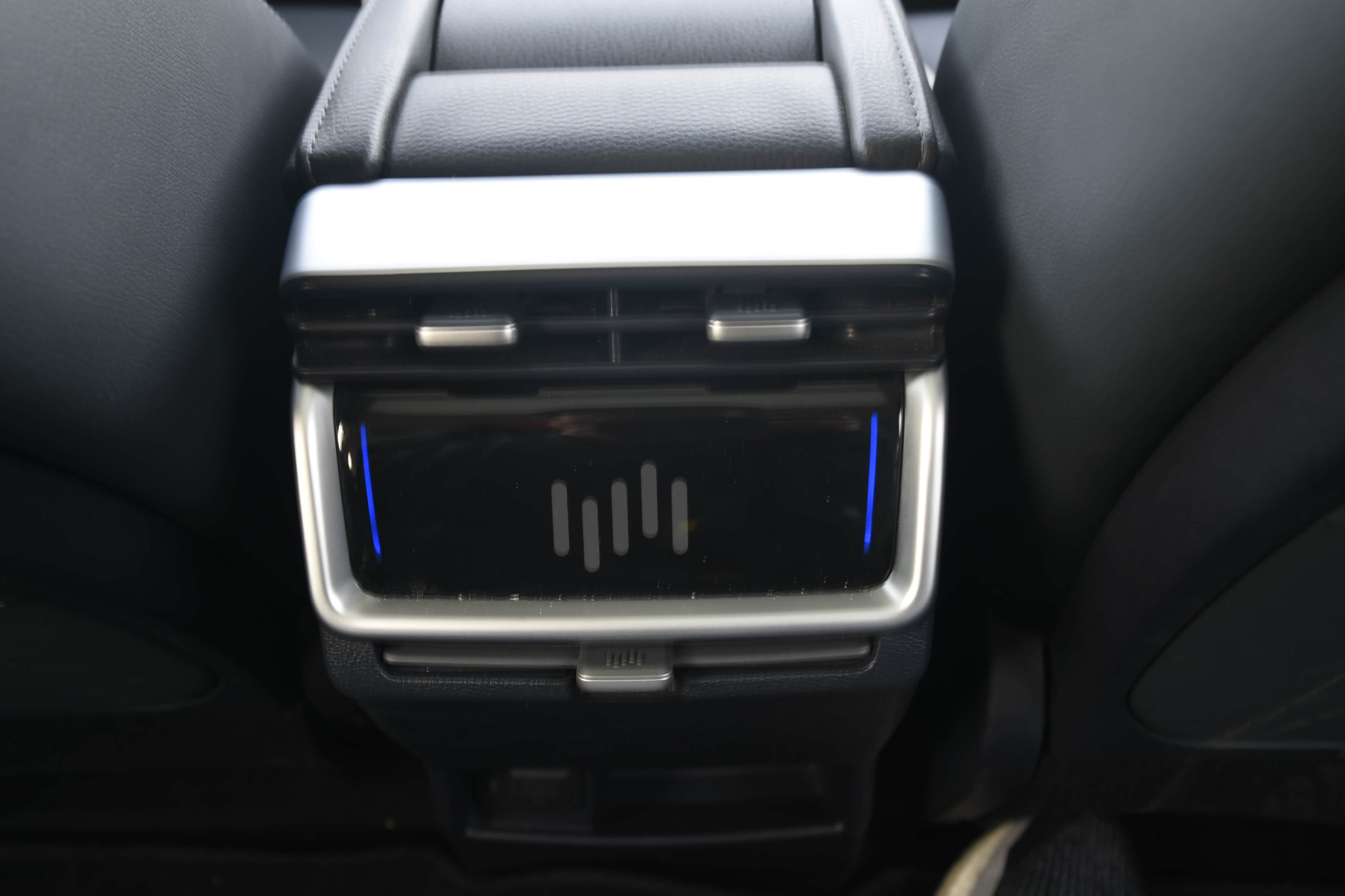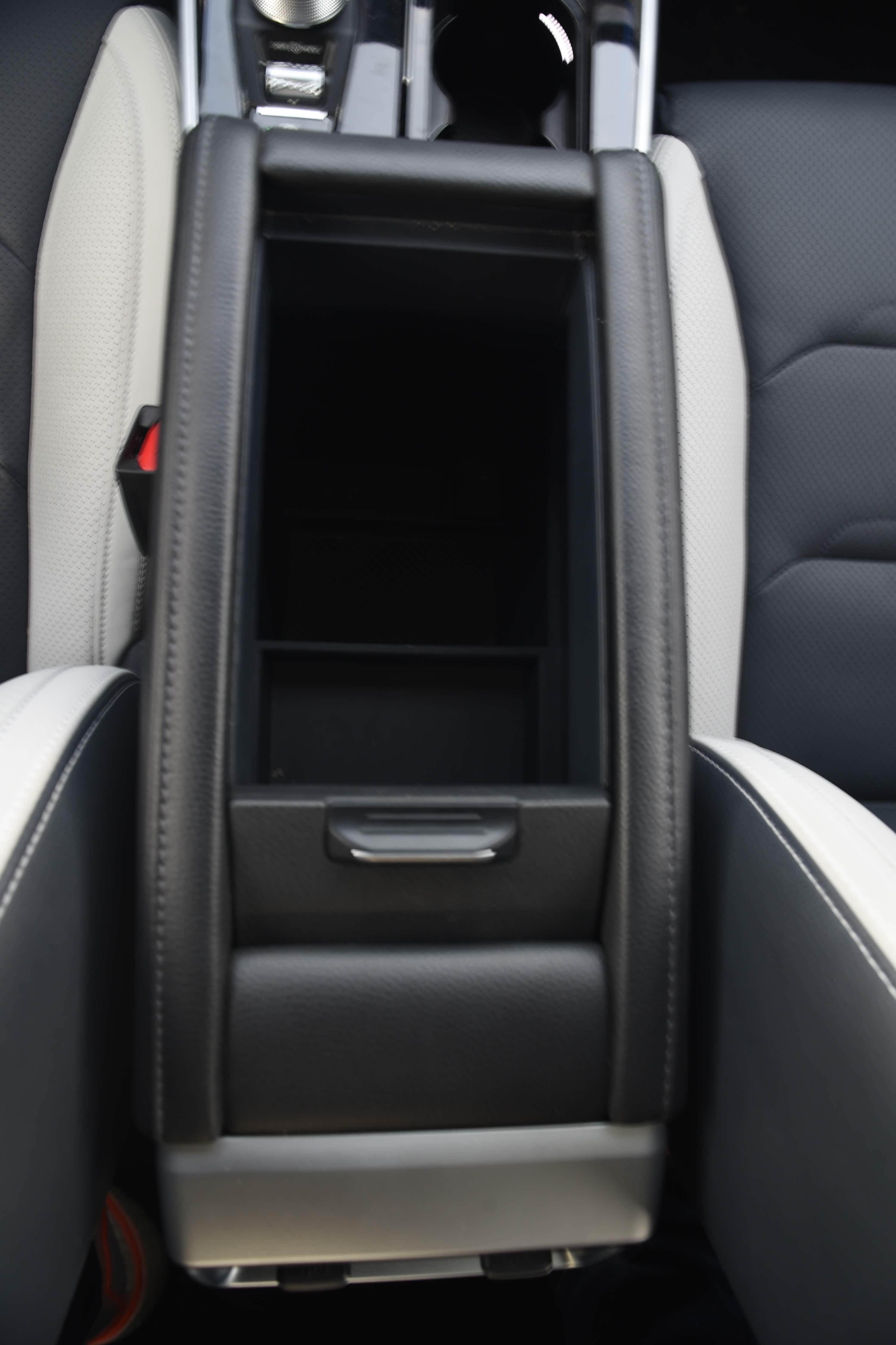 中央扶手下部配有一个12v电源接口和无线充电面板,还有一个储物槽,可以放部手机,使用起来十分便捷。