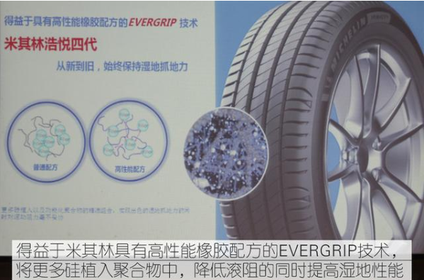 米其林Primacy 4轮胎,中文名为米其林第四代浩悦轮胎 ,此轮胎无论是全新还是磨耗状态,都有出色的湿地抓地力表现,它采用米其林的EverGrip技术带来的独特花纹设计,增加超过50%的排水空间,另外还采用高性能橡胶配方,确保轮胎在磨损的状态下,湿地抓地力表现依然出色。