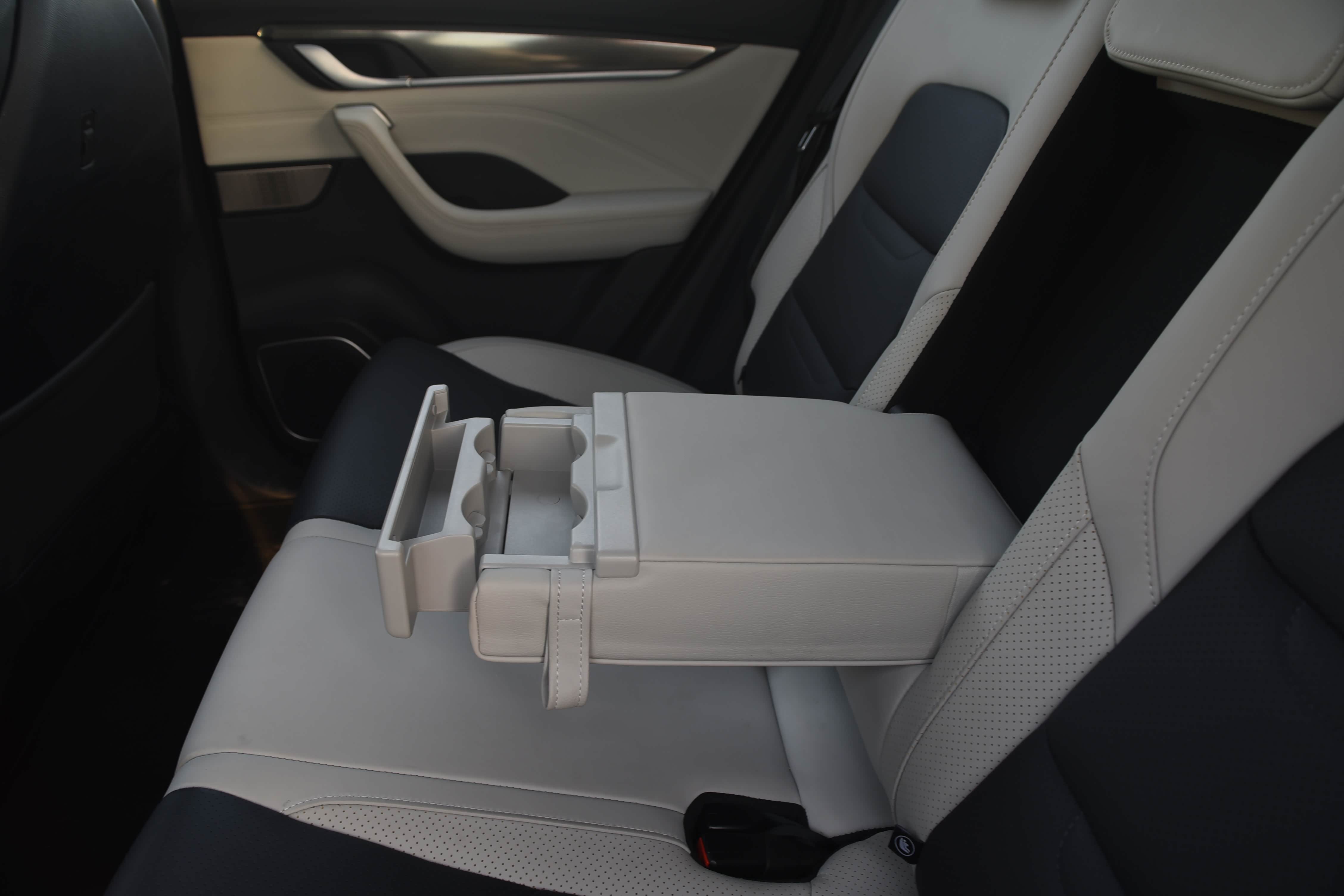 后排中央扶手设有两个中间未有隔挡的杯架,放水杯时需配有带盖的水杯,以免水杯易撒。也没配有储物槽,使后排乘客放只能把手机放在杯架内,这样设计不太人性化。