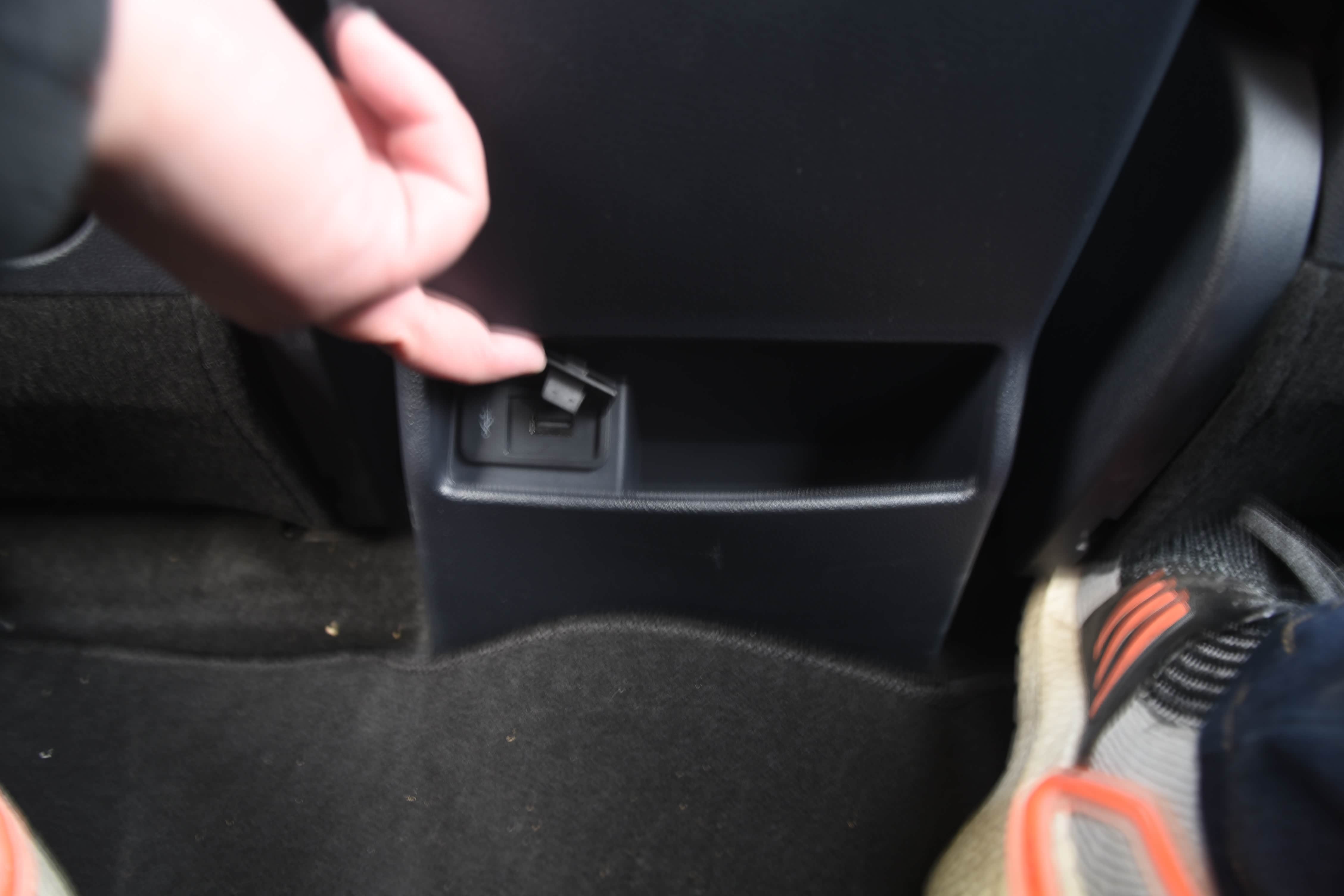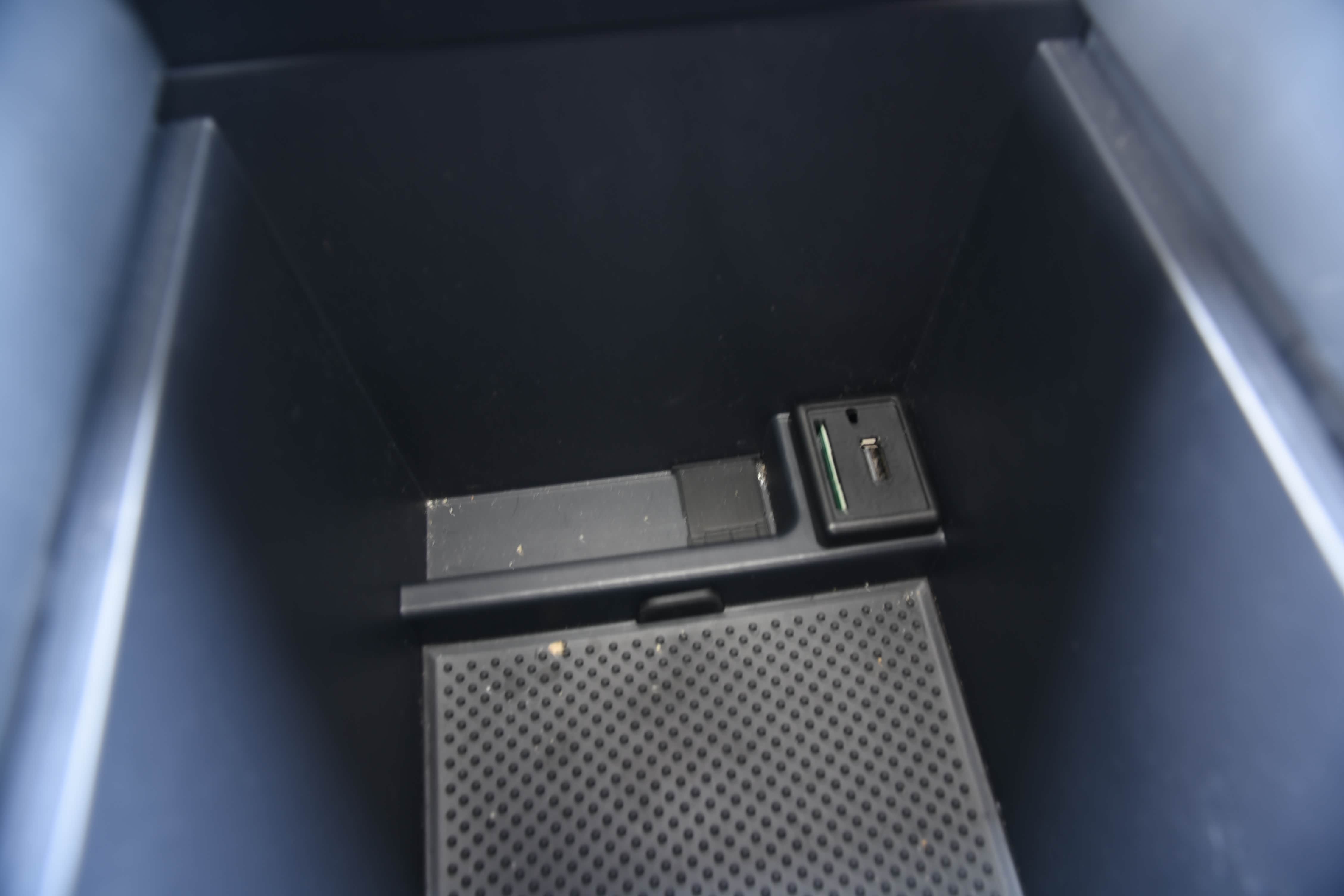 中央扶手后边设有一个较大储物盒,储物盒内可以放充电宝、驾驶证、行车证、钱包等经常用的物品。同时,储物盒内还配有1个USB接口和1个SD卡卡槽,这个设计挺不错的。