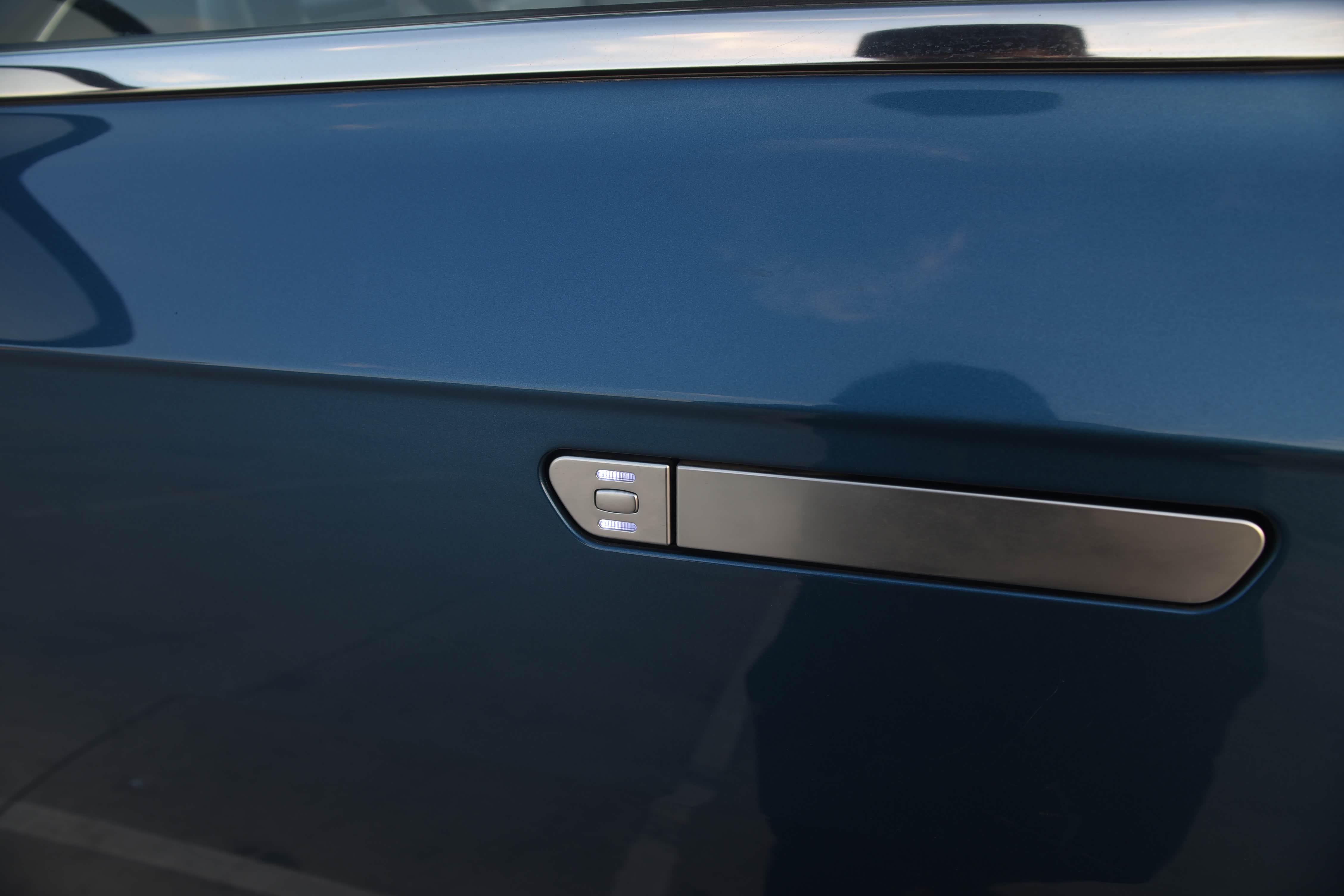 车身侧面,采用上下两条腰线设计,上腰线从前机盖延伸至尾部,拉伸了整车的视觉长度。下腰线看上去具有一定的肌肉感。隐藏式门把手可以降低风阻,再搭配双5幅双配色运动式轮毂,使整体车身看似更加运动。