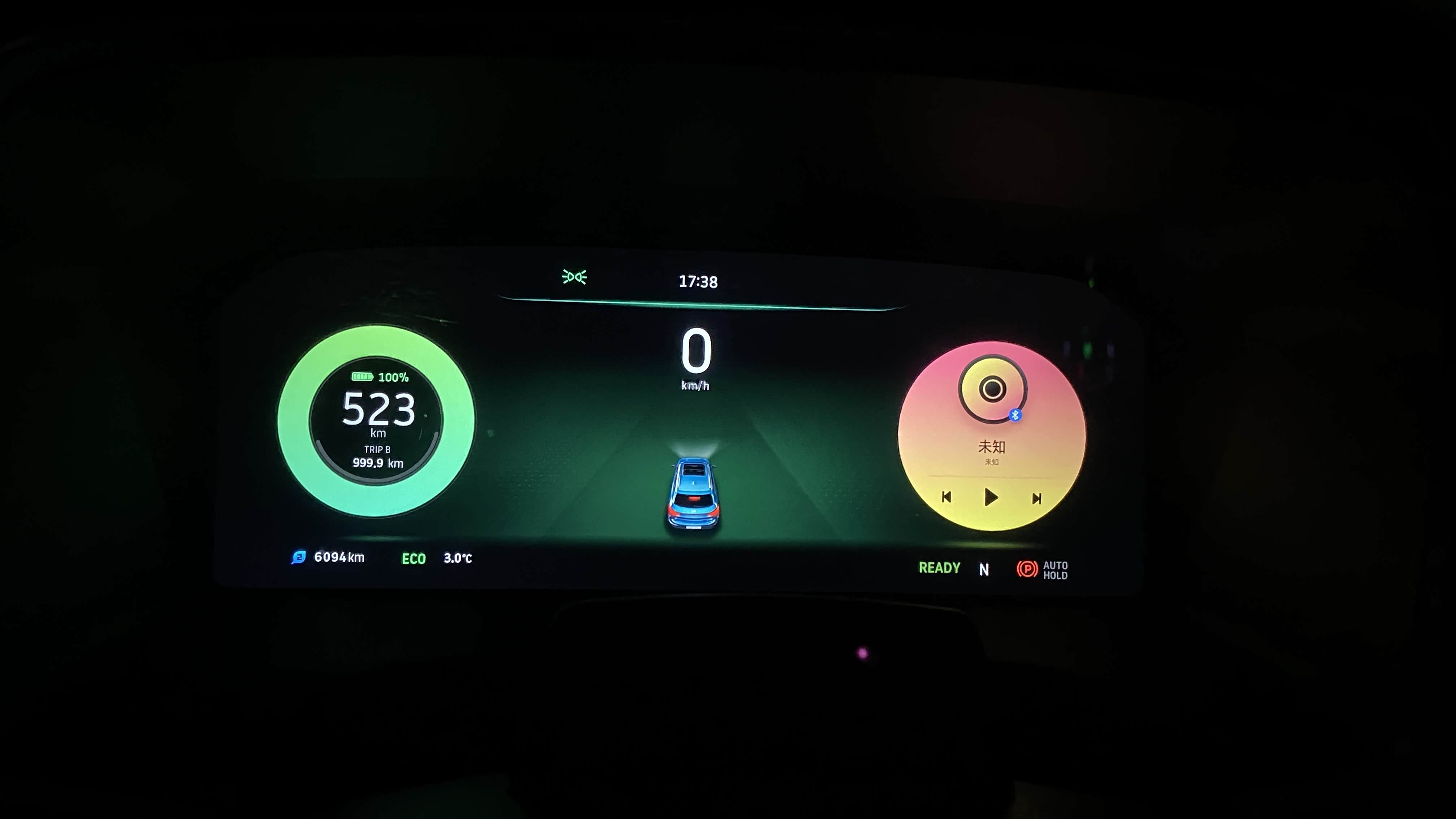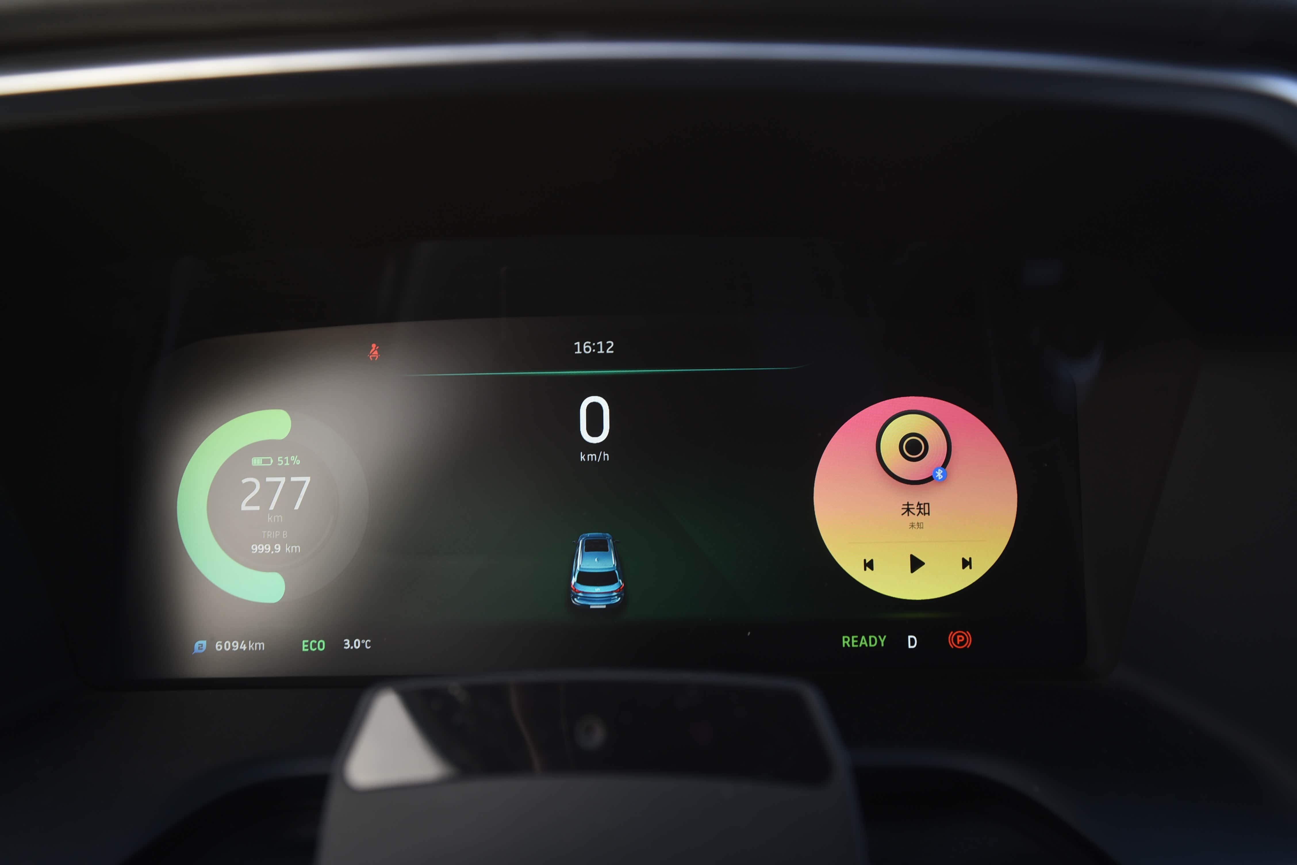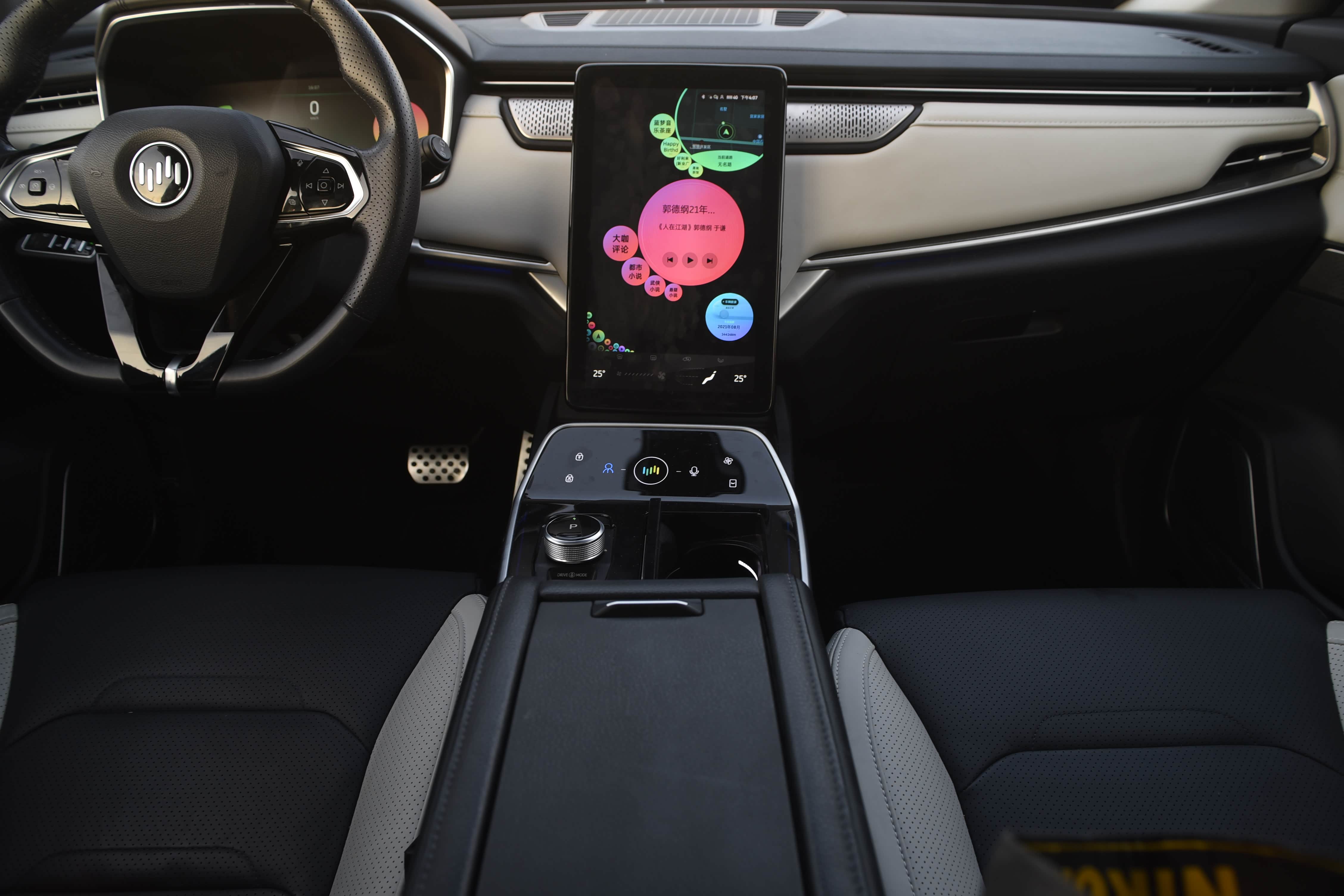 12.3英寸仪表盘内置续航、电池耗电量、动能回收、胎压监测、导航、微信、多媒体、ACC自适应巡航等功能,显示效果细腻。同时可以通过方向盘的控制键可以对仪表进行设置、调整和切换。