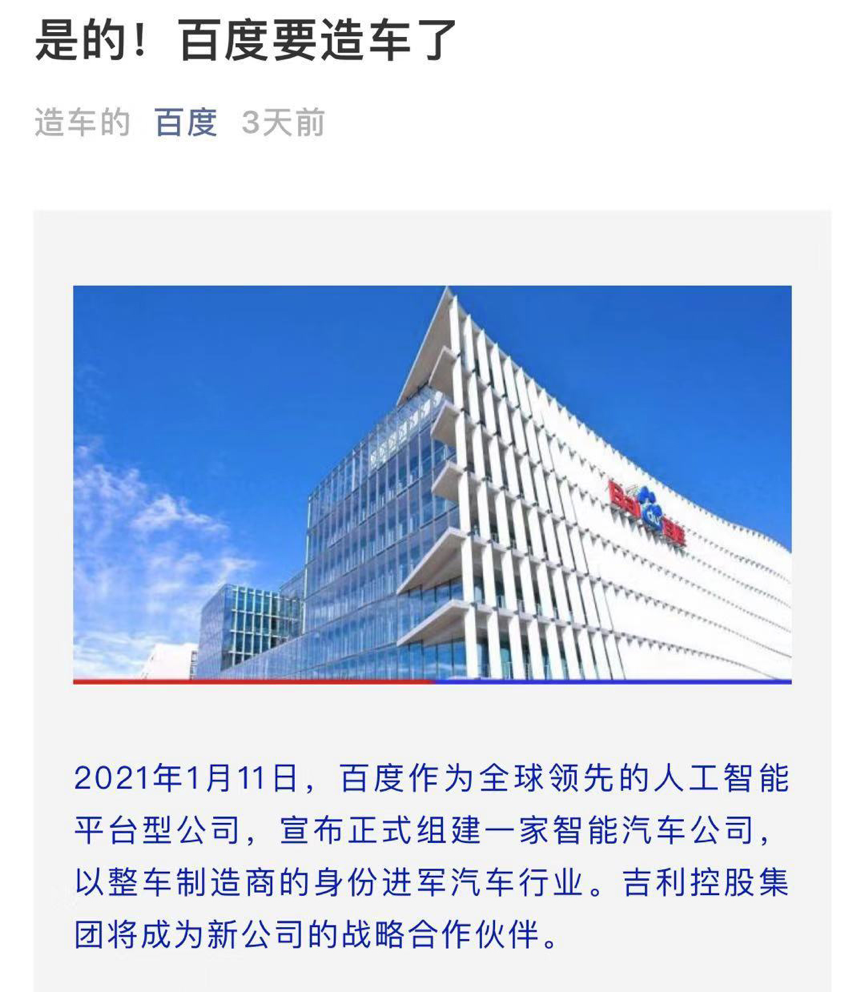 1月11日,浙江吉利汽车控股集团(以下简称吉利集团)宣布与百度组建智能电动汽车公司;两天后,1月13日,吉利集团宣布与富士康科技集团共同签署战略合作协议。