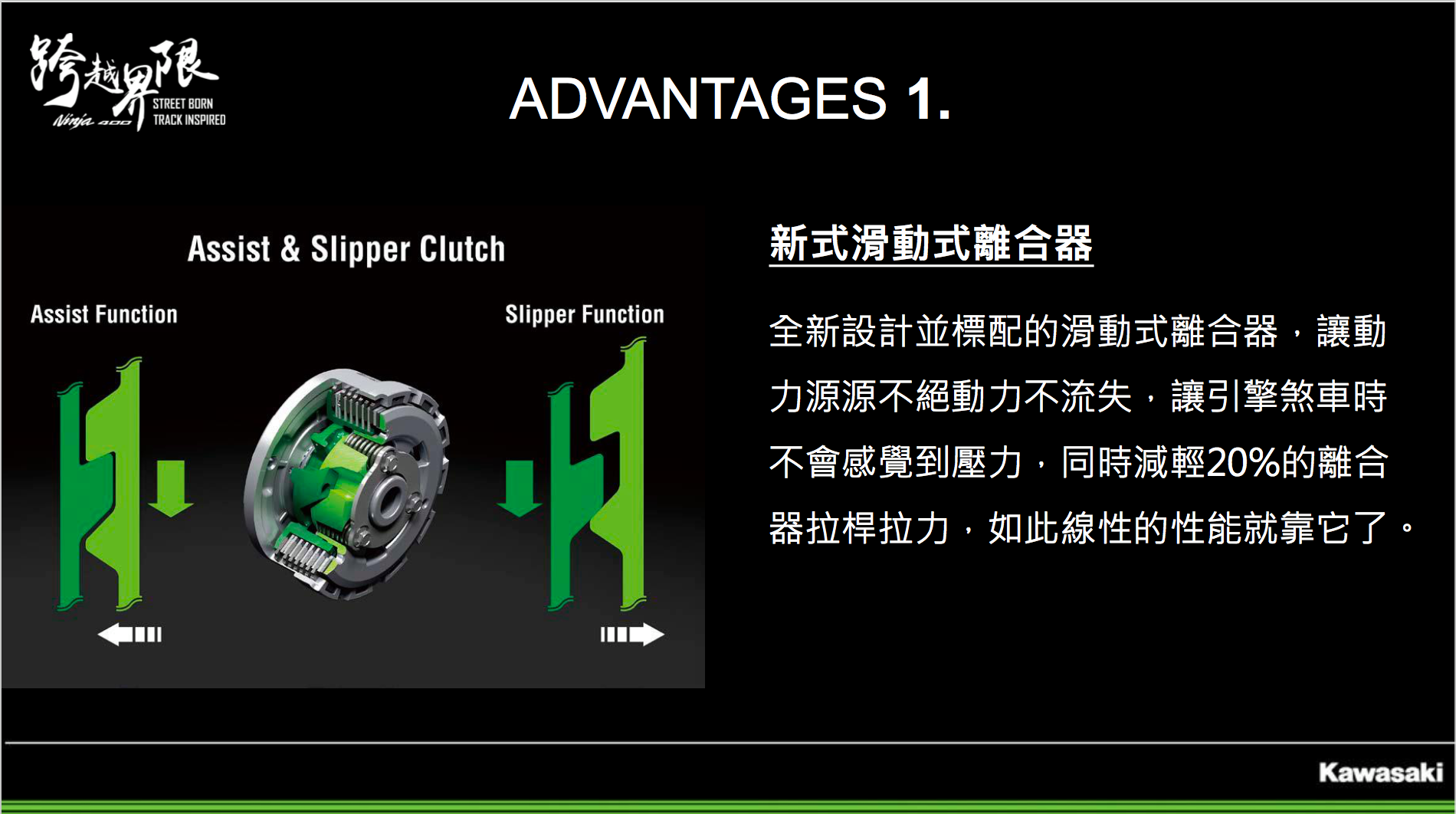 Ninja 400配置滑动式离合器,能有效降低退档时,引擎刹车所造成的顿挫感,减少对于车辆动态的影响,同时也可使其式在操作离合器时更加省力。即使长途行驶,多次握放离合器拉杆,也不易感到疲累。贴心的设计,让30%的车主感到相当满意。