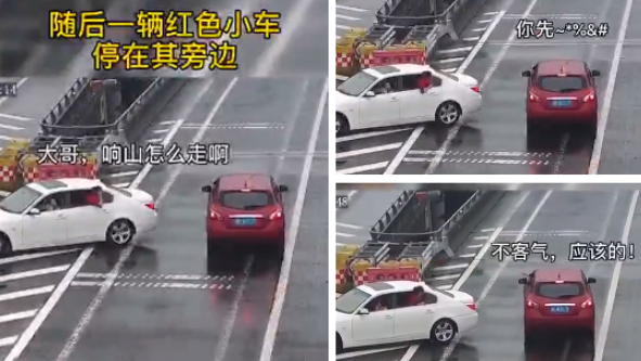 红车车主也是够虎,大剌剌停在匝道中间,“热心”地为白车指点方向。