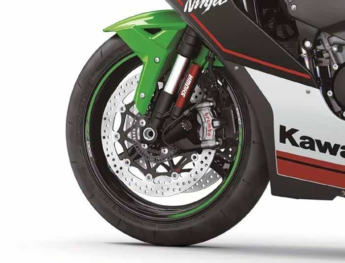 2021款 ZX-10R的前后悬挂均为SHOWA品牌,外置阻尼阀的Balance Free Fork(BFF)在上代车型就已经出现。不同的是,刹车系统前轮升级为Brembo M50对向四活塞卡钳,搭配直径330毫米的浮动刹车盘,更优秀的制动力也能够很好地保障激烈驾驶时的操控性与安全性。