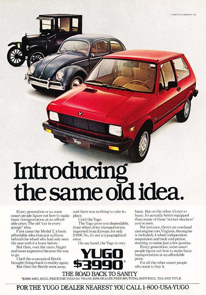 一方面,Yugo作为最便宜的汽车在硬件素养上物美价廉;再加上布里克林"诡计多端"的营销手段,Yugo广告中直截了当表名"这是一部和甲壳虫、福特T型车一样的廉价优质小车",一下子让对于南斯拉夫汽车毫无概念的美国人瞬间买单。Yugo在登陆美国两之内卖出了将近8.5万辆。