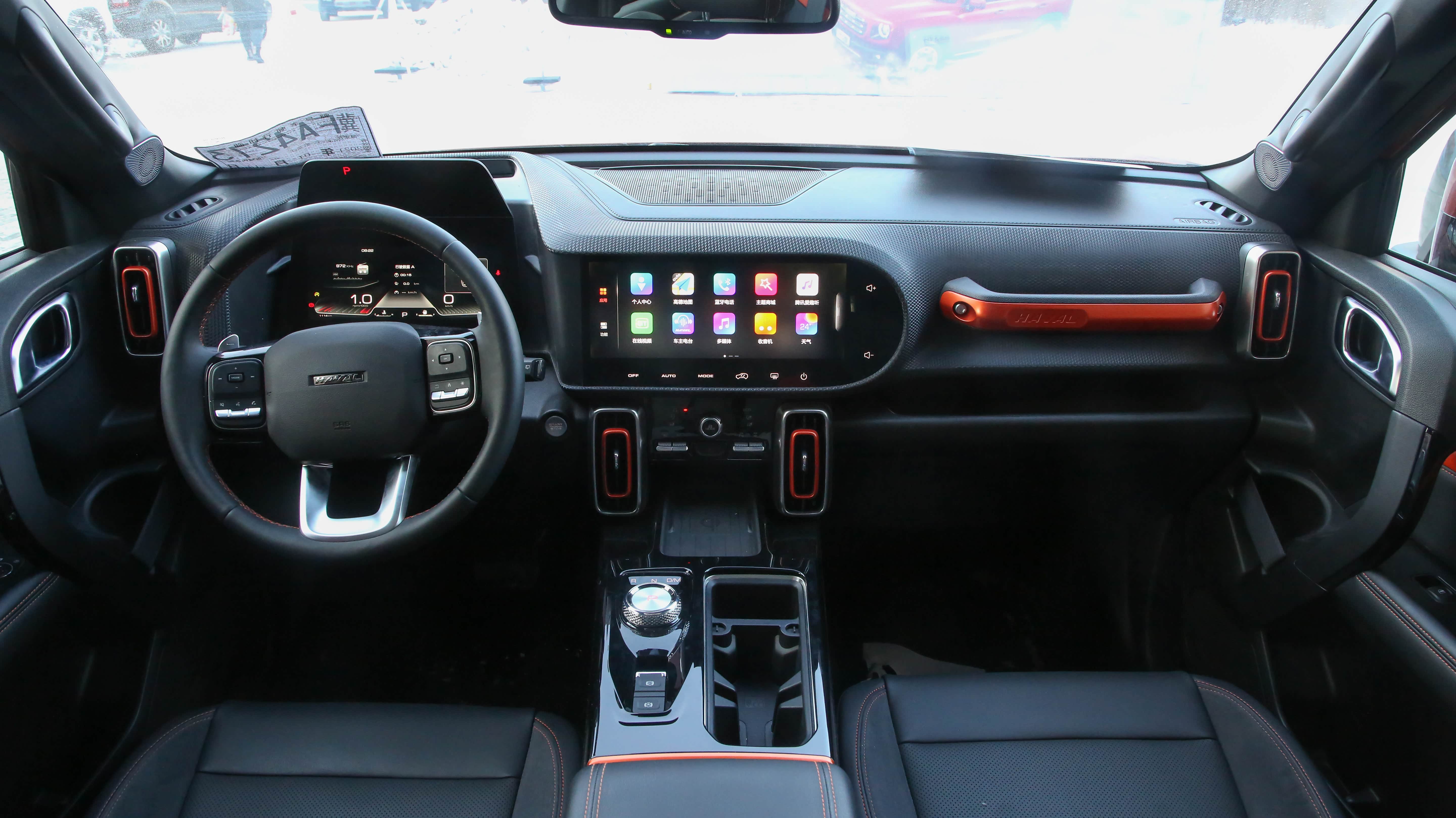 内饰的黑橙撞色设计体现出大狗的年轻化,裸露的铆钉和副驾的粗壮把手以及门板上的水杯束缚绑带都在彰显着大狗的“野性”。对于哈弗大狗的购车用户来讲,外观占购买决策的比重其实并不大。价格、动力、配置、空间、舒适性这些才是他们更为关注的。显然,大狗的设计者摸清了消费者脉络,外观足够硬朗,但内在依旧是顾家的。