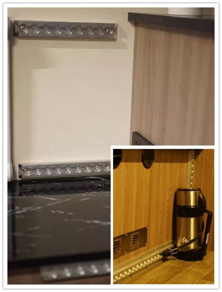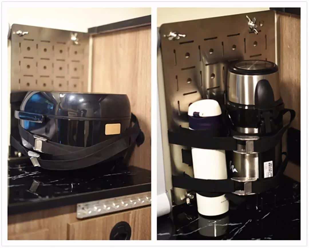 可自由搭配洞洞板与扎带进行排列组合,固定随车用品,防止滚落。(电饭煲、保温杯均为演示需要,不属于房车配置)