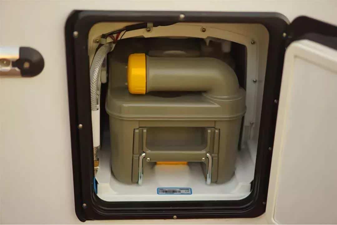 通过拉动座便器底部开关即可打开黑水箱防异味隔板,使污水流入黑水箱内。座便器黑水箱容积为16.4L,在水箱上带有黑水箱水位提示灯,当红灯亮时则是在提醒车主及时处理黑水箱。