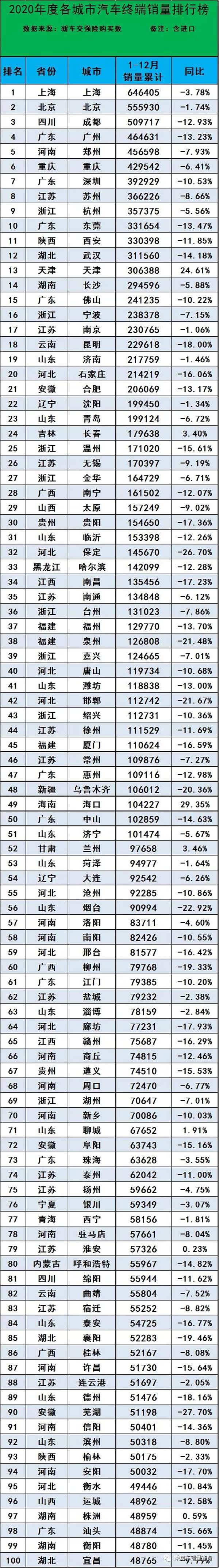 2020年全年全国共有51座城市汽车销量突破10万辆,共有94座城市销量突破5万辆,除西藏拉萨外,全国其他省会城市2020年全年汽车销量均突破5万辆。“有惊无险”的2020年已成历史,汽车行业虽说较2019年略有下滑,但仍呈现出旺盛的需求,对于汽车厂家来说,残酷的竞争或在2021年更为激烈,这就倒逼车企对于新车型的研发、新技术的运用、新能源汽车的布局等等均提出了更高的要求,期待2021年汽车行业有较大的提升和突破。