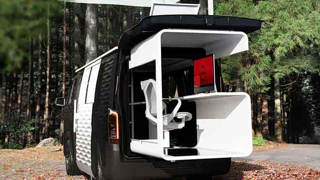 车内的前排座椅为驾驶席和副驾驶席,而后部的空间则被改装成了一个办公室,包含一张办公桌和一个办公椅,并且还配备了大尺寸的显示器,在车辆的顶部还设计了一个阳台,并配备一把休闲椅和一把遮阳伞,如果用户需要休息的时候,可以在上面放松下。