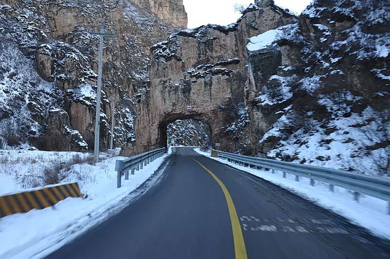 进山后不久,有一段山势非常狭窄,路上一连出现几个凿开的“门洞”,靠它穿山而过。