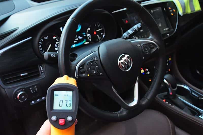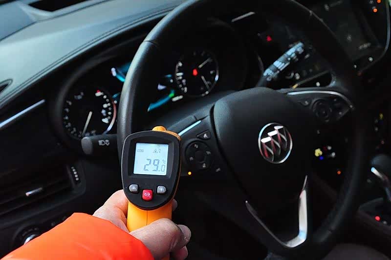 先用测温枪看了一下,方向盘的温度是零下23度。开启加热后大概1分钟,升至7.9度,2分钟后升至15.6度。