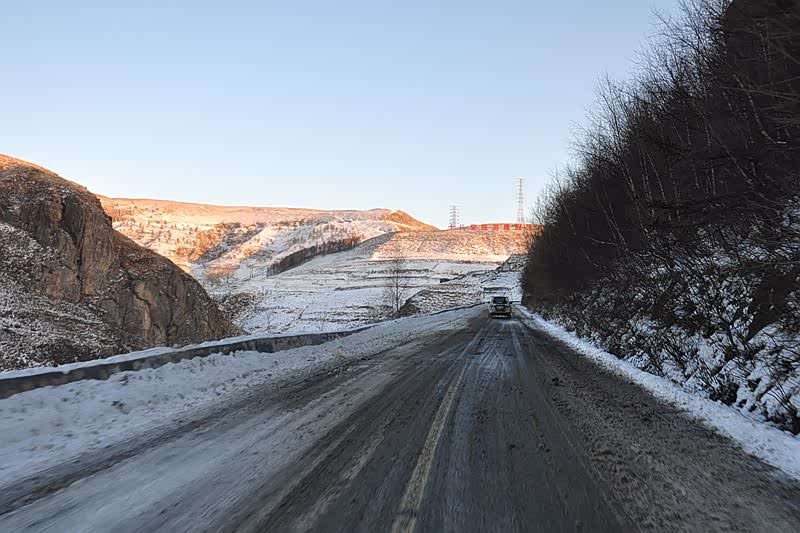 查询地图得知,这一带有2座摩天岭。一座在张家口地区的蔚县,另一座在保定地区的易县。沿着狭窄的小路,我首先前往蔚县摩天岭。虽然地面上覆盖着冰雪,但行驶很顺畅。