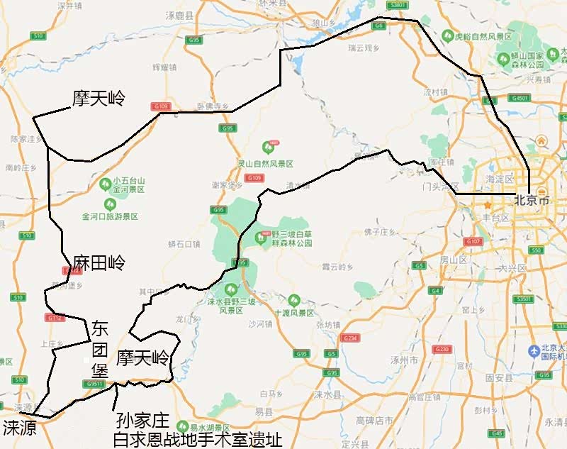 如果是真正意义上的新车,我会单纯琢磨车。如果是年度改款车型,只要条件允许,我会另增一些内容,把它变成自驾游。当然,我的自驾游每次都有个主题。比如这次,从下图可以看出,路线是从北京往西,然后往南,从张家口地区走到保定地区,路线中一南一北有两座摩天岭,中间有座麻田岭。为啥会这样规划呢?书上说,八路军在摩天岭对日作战,白求恩亲临火线救助伤员,在隆隆炮声中不慎割破手指,感染后壮烈牺牲。那么,摩天岭战斗是怎么回事,它究竟位于何处?便是这次的主题。